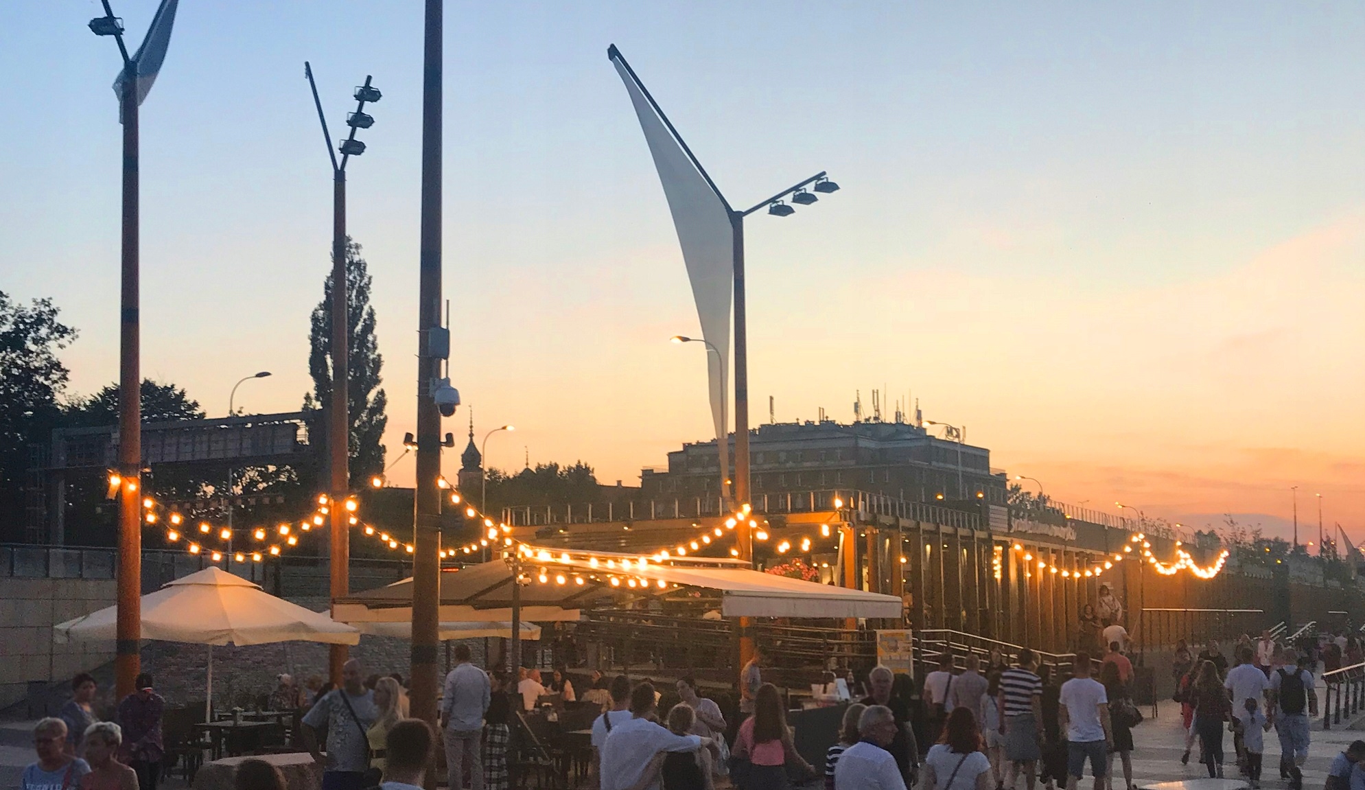 На фото ниже представлена наша гирлянда с лампочками накаливания А60 мощностью 4,5 Вт, которая расположена на Вислинских бульварах. в Варшаве.