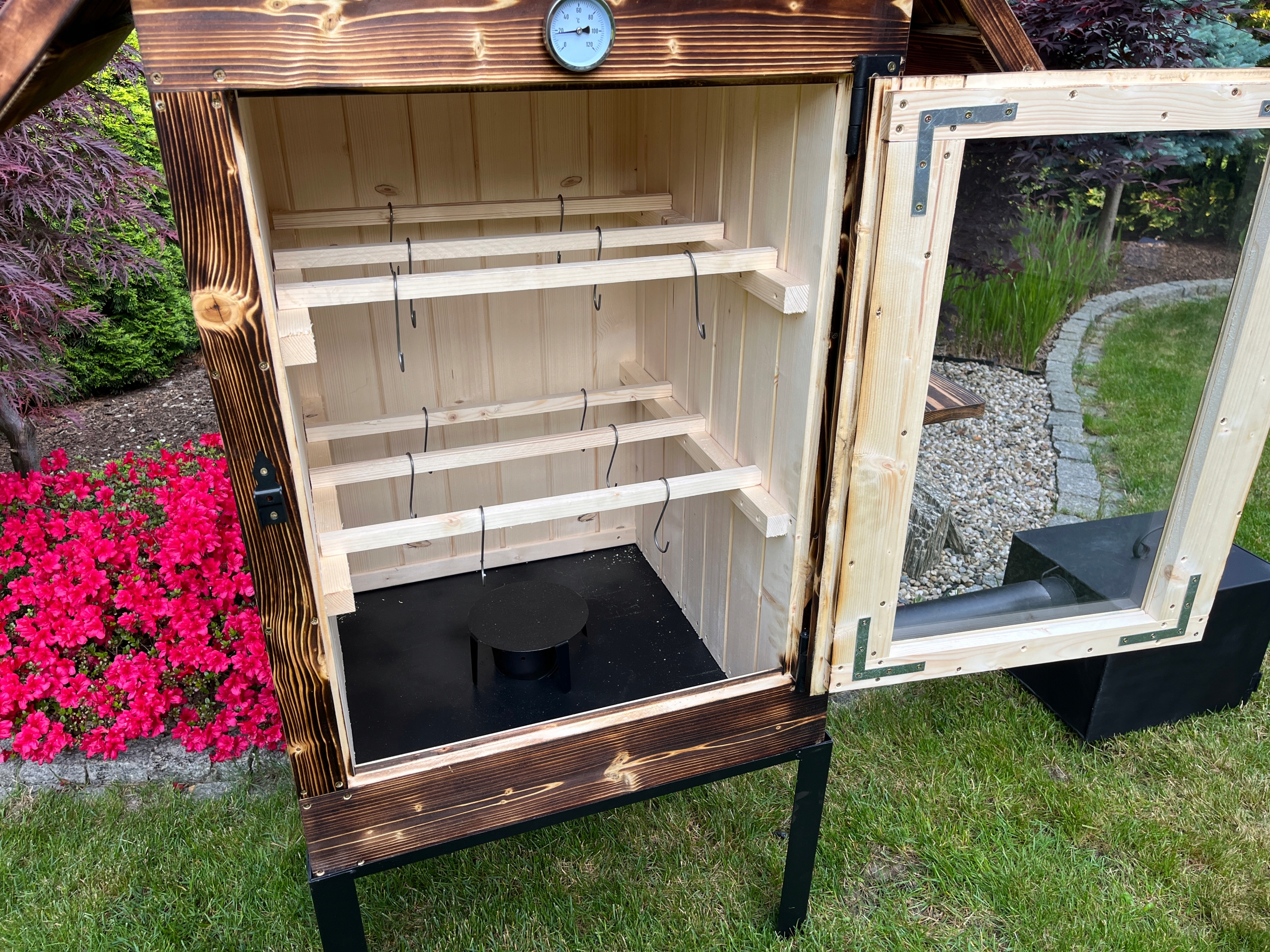 Коптильня, как вы можете видеть на фотографиях, имеет ЗАКАЛЕННОЕ СТЕКЛО - благодаря ему мы можем наблюдать за процессом копчения наших копченостей, а кроме того это чрезвычайно приятно украшение нашей коптильни.