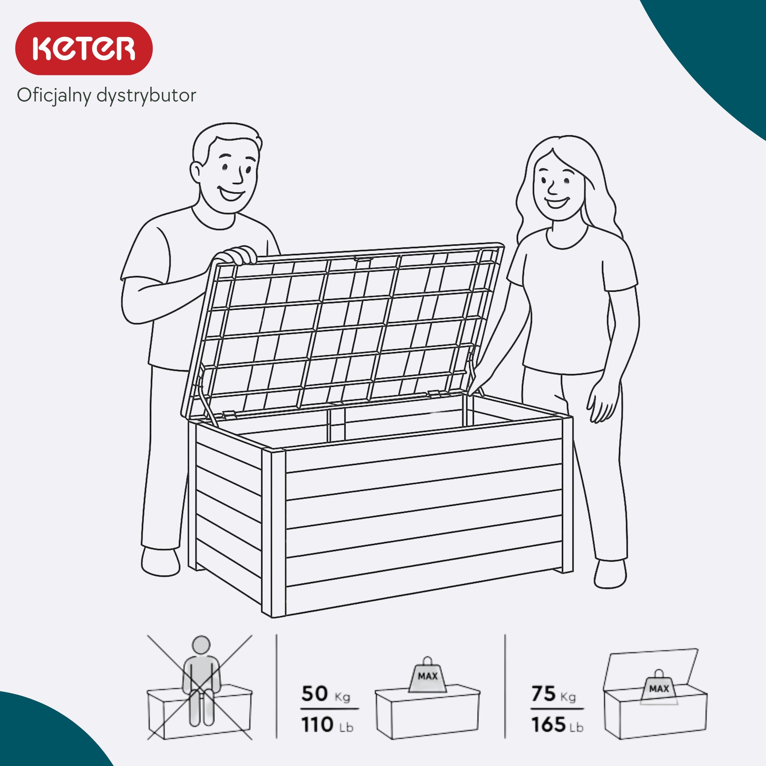 Важно! Вы не можете сидеть на груди. Крышка сильная и долговечная, как в небольших сундуках в этой серии, которые поддерживают вес до 275 кг, но из -за размеров сидящей коробки передач запрещено.