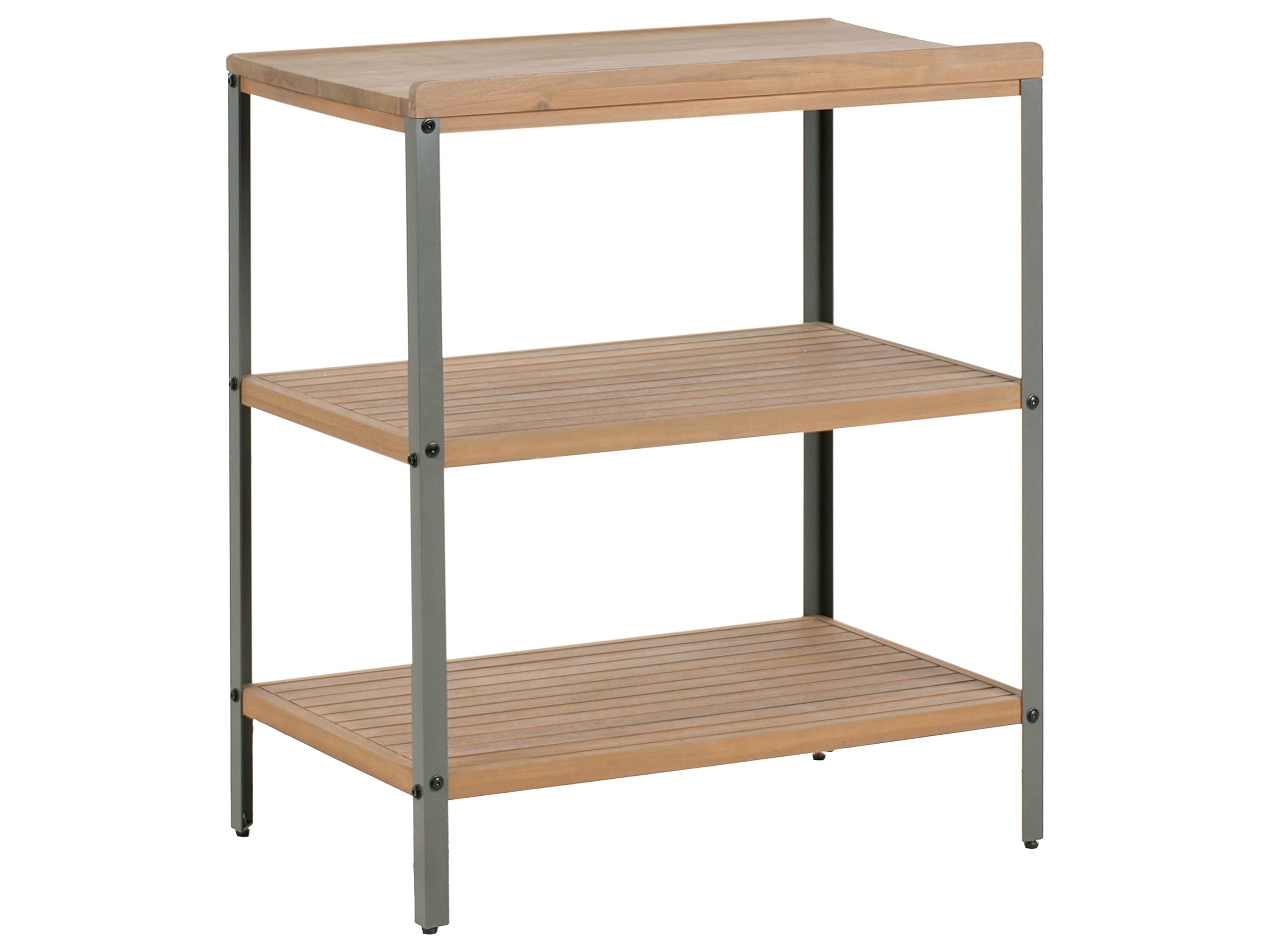 Садовая кухня с раковиной, двумя коричневыми и черными полками