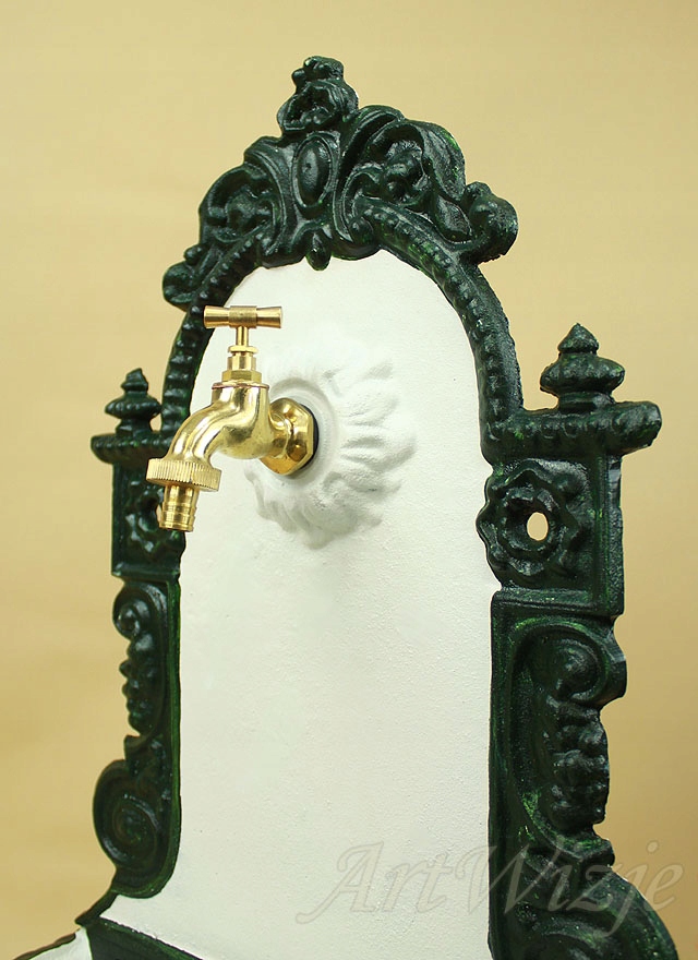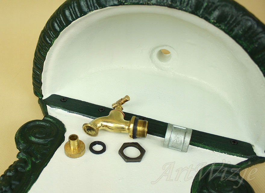 Чугунный подвесной излив (раковина) с бело-зеленым краном.