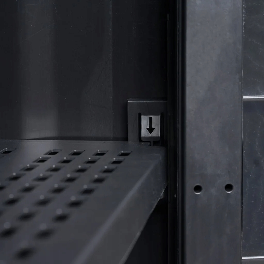 Шкаф со знаком качества TÜV-GS изготовлен из прочного и долговечного полипропилена (ПП). Имеет вентилируемую полку с регулируемой высотой, что позволяет разместить на ней предметы различного размера. Для дополнительной безопасности его можно запереть навесным замком (замок не входит в комплект).