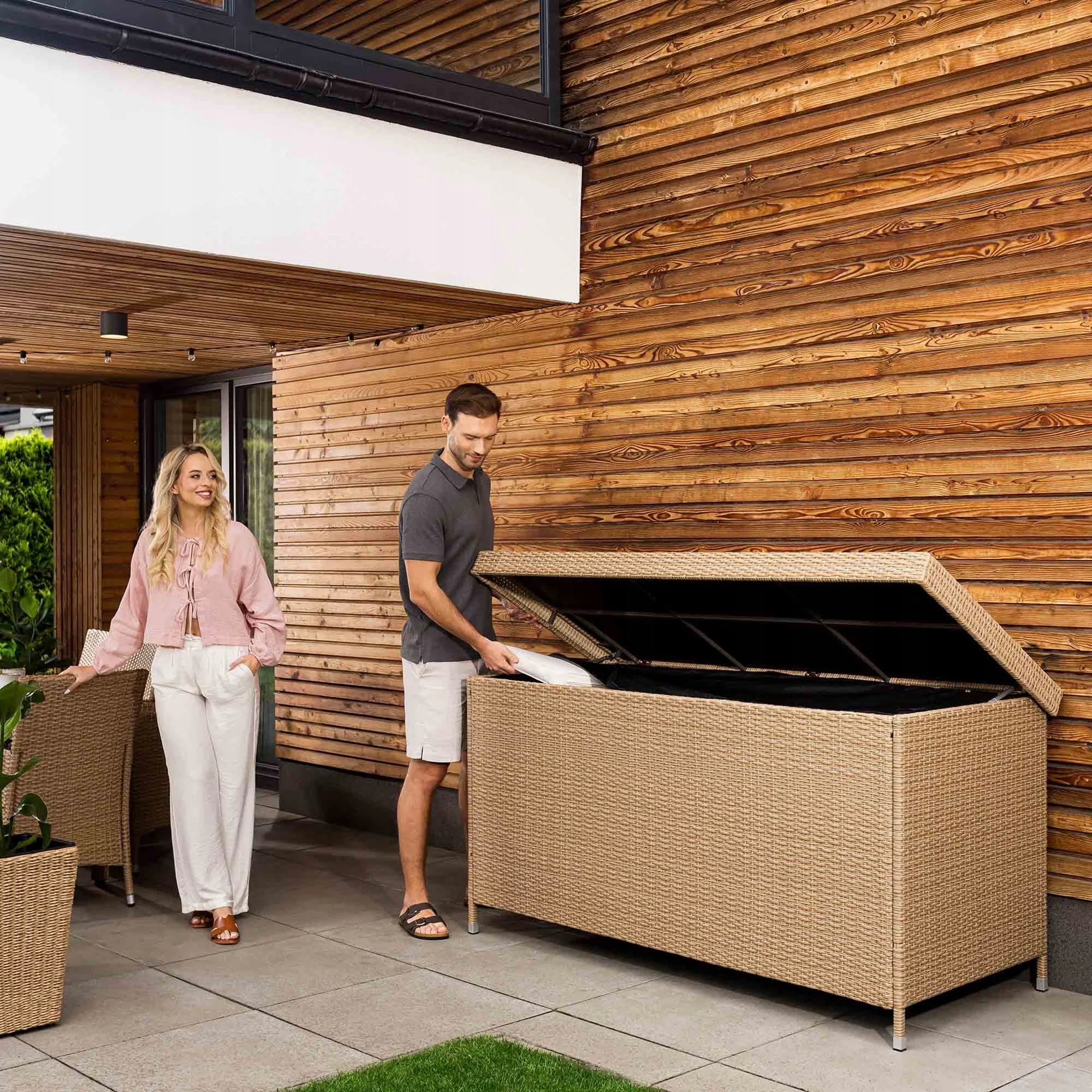 Садовый ящик Belia от di Volio — это идеальное сочетание стиля и функциональности. Этот большой садовый ящик емкостью до 870 литров, изготовленный из прочного экологичного ротанга и усиленный стальным каркасом, идеально подходит в качестве места для хранения подушек, чехлов и садовых принадлежностей. Оснащен прочной крышкой выдержкой 220 кг. Коробка для садовых подушек создана для защиты содержимого - водонепроницаемый чехол на молнии и приводы для легкого открывания гарантируют удобство использования. Выбирайте садовый ящик Belia, который сочетает в себе эстетику, долговечность и надежность!