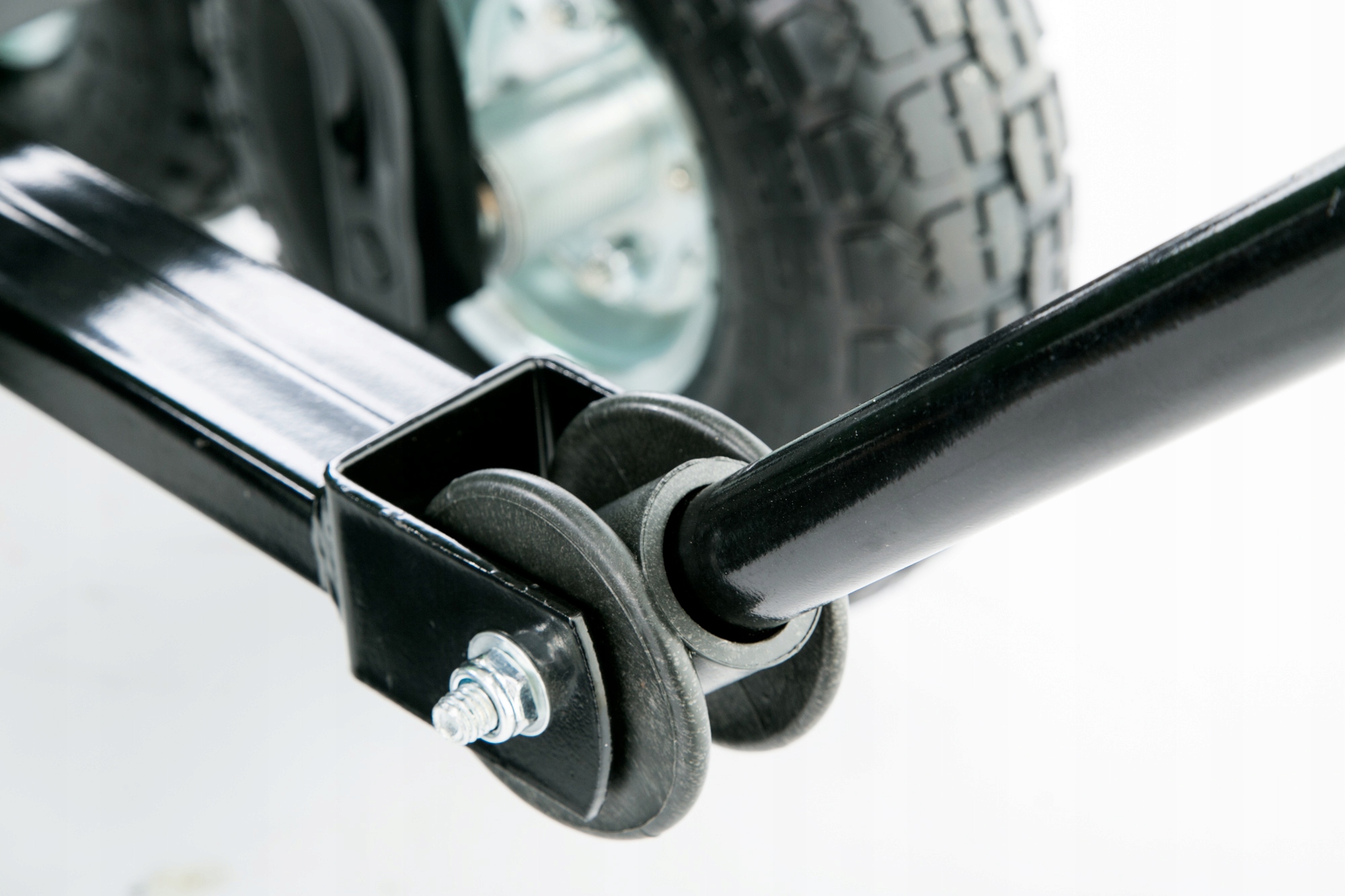 Практичные и прочные надувные колеса обеспечивают универсальность использования. Предлагаемые колеса легко покроют практически любой тип поверхности. Шины с резиновым протектором обеспечивают хорошее сцепление, а внутренняя камера обеспечивает амортизацию. Надувные колеса позволяют регулировать давление в зависимости от веса перевозимого груза и поверхности. В основе конструкции колес лежат ободья из оцинкованной стали (коррозионностойкие). Колеса дополнительно усилены внутренними винтами, что повышает их долговечность.