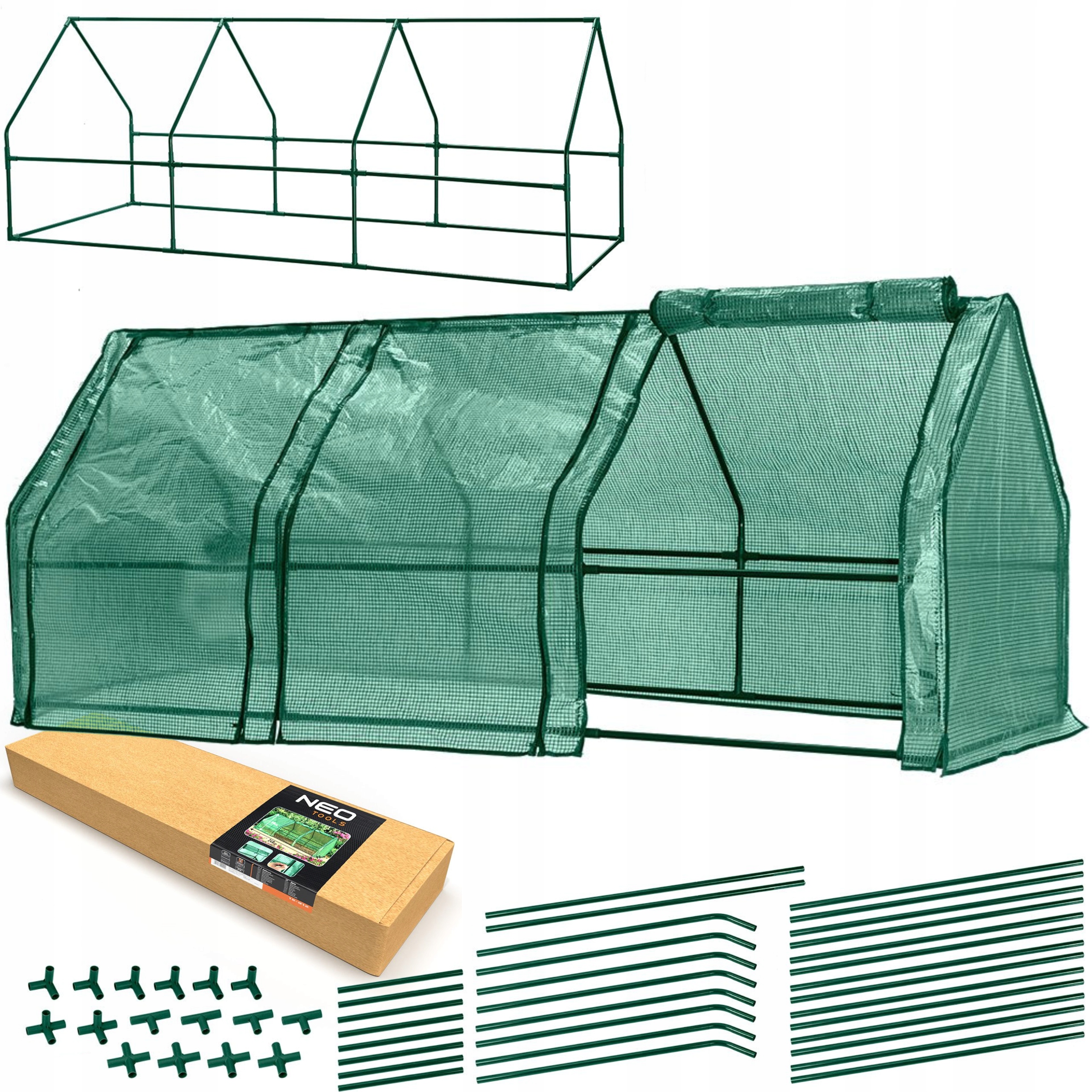 Для использования дома и вне дома теплица с металлическим каркасом и полиэтиленовой пленкой от бренда NEO TOOLS. Его размеры 240 х 90 х 90 см. В теплице созданы идеальные условия для выращивания зелени, рассады овощей и фруктов. Он удобно закрывается на молнию – кроме того, есть возможность завернуть отверстия в боковой стенке.
