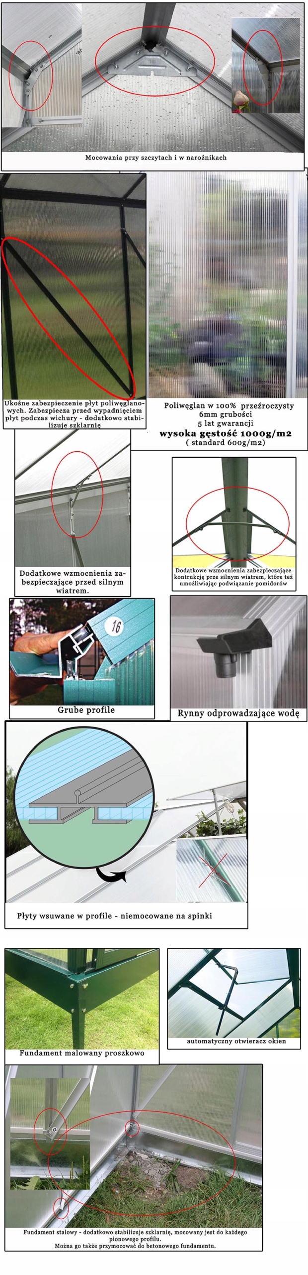 В данной модели использованы пластины поликарбоната толщиной 4 мм повышенной плотности. Конструкция устойчива и устойчива к сильному ветру и снегу. Модель 2023 года включает в себя дополнительные усиления для каждой поликарбонатной пластины, которые полностью защищают пластины от продувания внутрь. Теплица наверху имеет специальные усиления, позволяющие подвязывать, например, ветки томатов. Между профилями вставлены пластины поликарбоната, что дополнительно защищает их от сдувания сильным ветром.