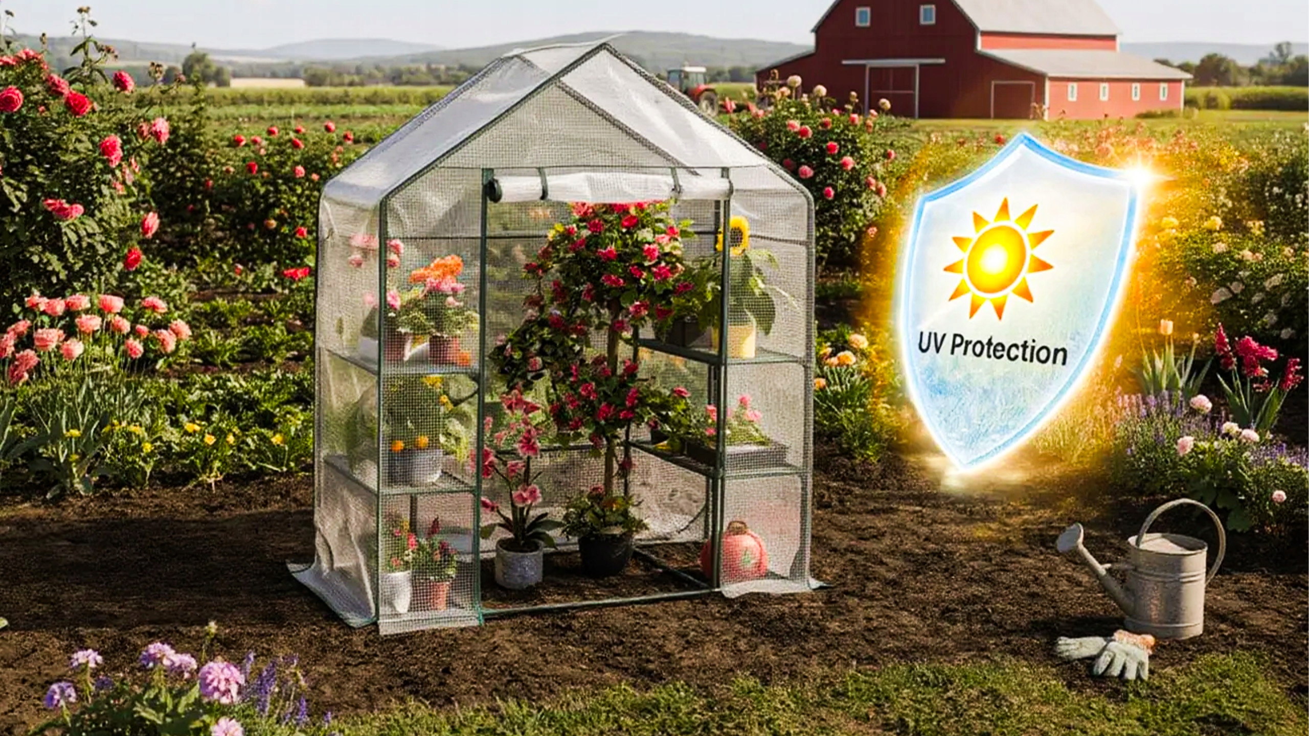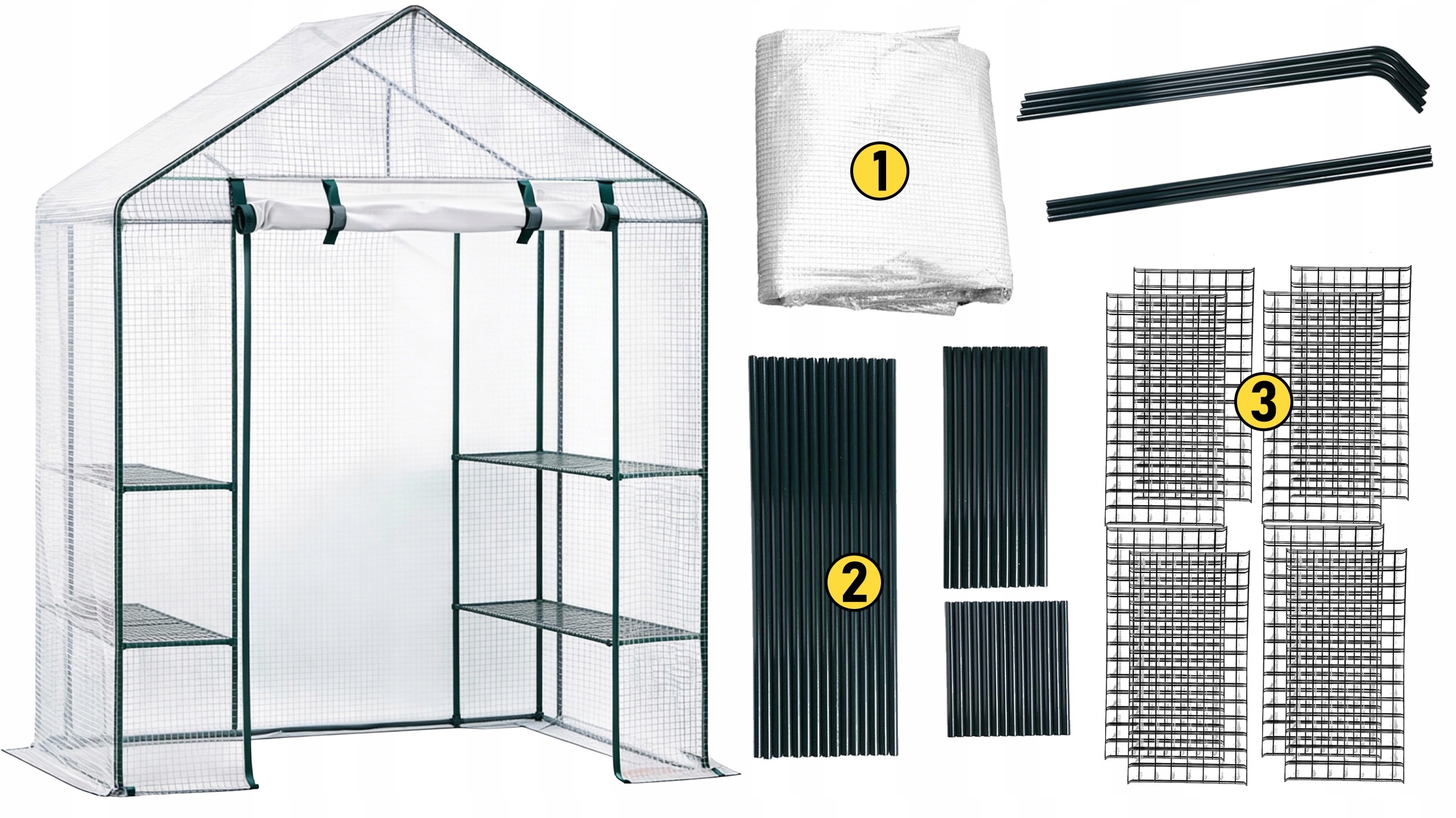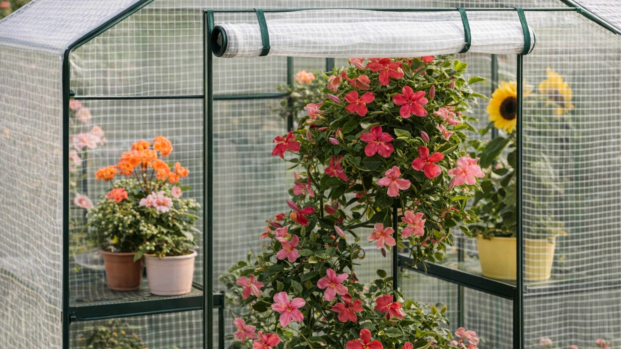 Покрытие из прочной полиэтиленовой сетки плотностью 135 г/м² обеспечивает растениям защиту от дождя, ветра и колебаний температуры. Этот материал устойчив к разрывам и в то же время пропускает необходимое количество света, поддерживая здоровый рост растений.