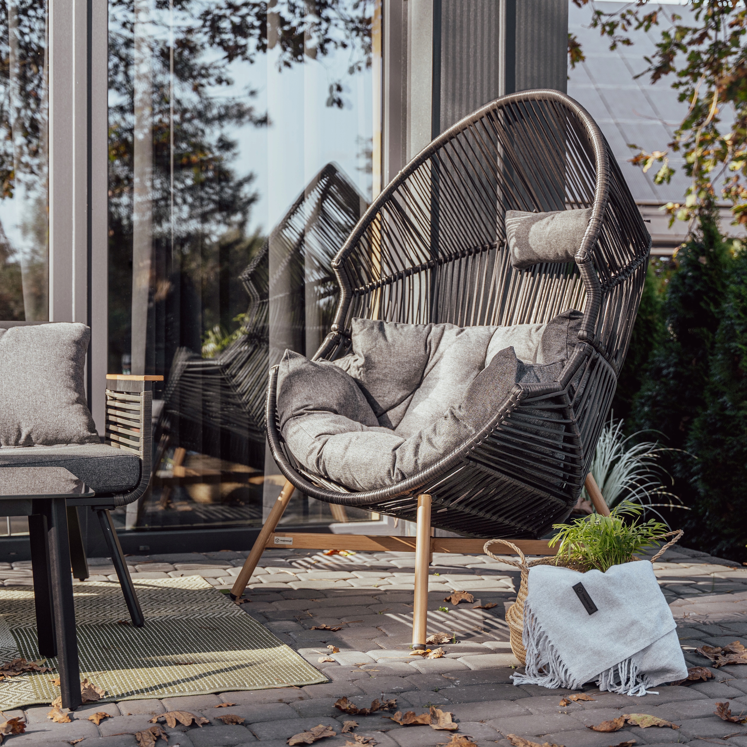 Большое садовое кресло было разработано таким образом, чтобы предоставить пользователю комфорт и удобство. Polirattan Basket со стальной рамой является твердой и не деформируется. Есть просторная мягкая подушка из полиэстера. Это приятный материал, который легко поддерживать чистоту. Наволочки, оснащенные молнией, так что их можно легко удалить с подушек и промыть. Стальные ножки в цвете, подражая древесине, держат всю конюшню кресла на каждой земле.