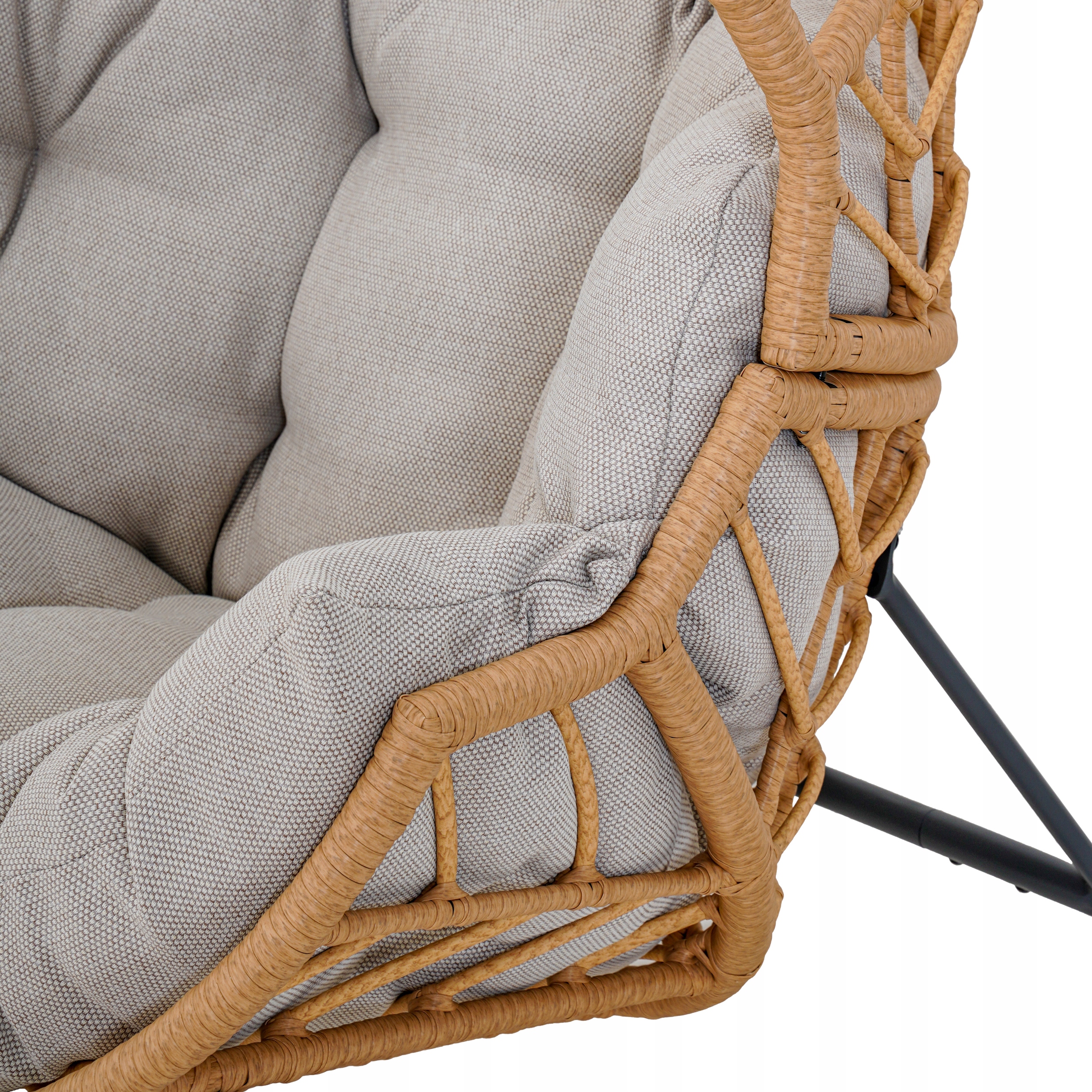 Корзина из полиротанга отличается эстетичным внешним видом, а также исключительной долговечностью и устойчивостью к погодным условиям. Его структура не деформируется под воздействием влаги, солнечных лучей или перепадов температуры, а значит, кресло сохраняет свой внешний вид и функциональность на протяжении многих лет эксплуатации на открытом воздухе.