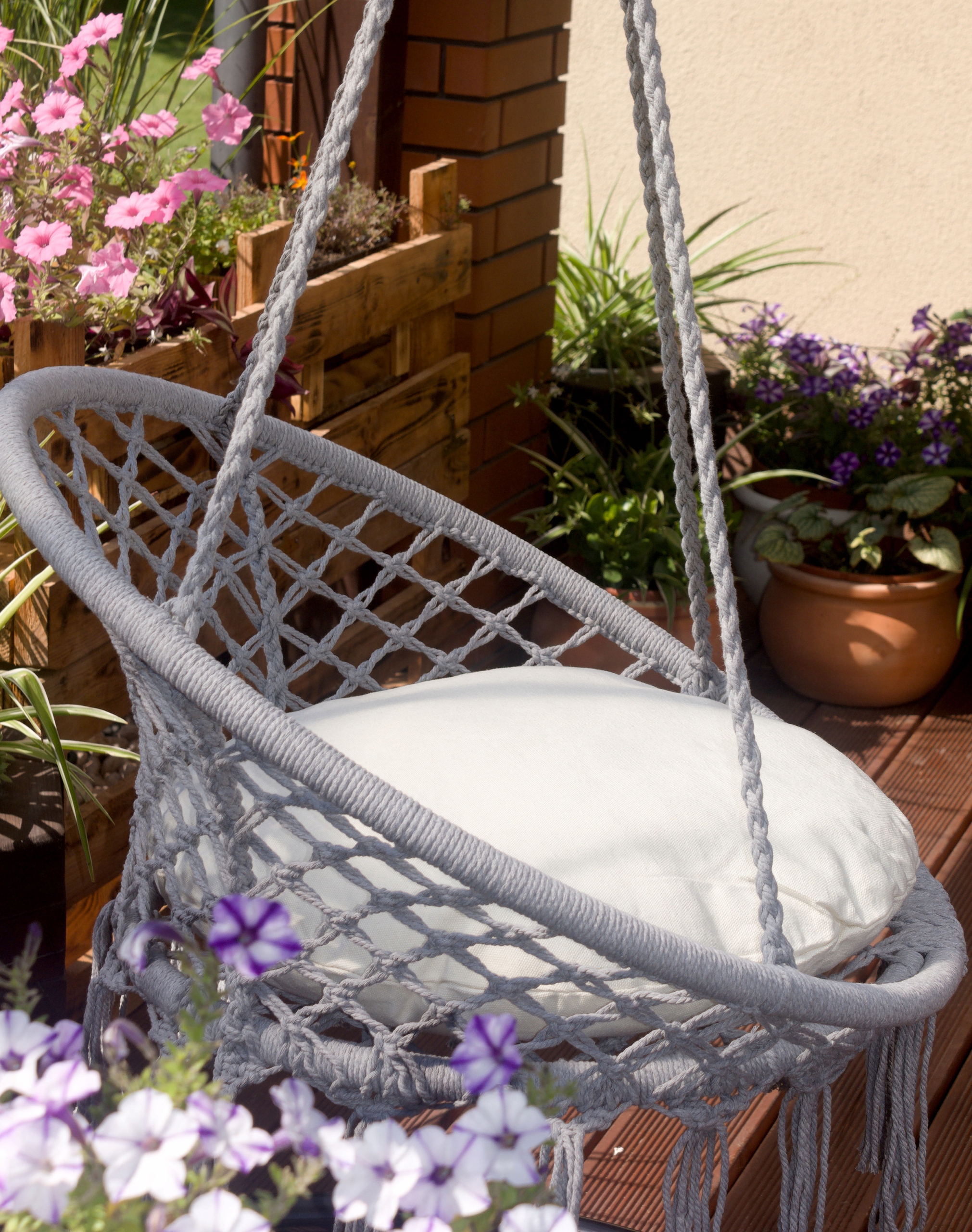 Наше подвесное кресло выглядит чрезвычайно современно и элегантно, добавляя неповторимый шарм любому интерьеру или саду. Его уникальный дизайн и привлекательный, расслабляющий цвет станут прекрасным украшением и обогатят эстетику любого места, где он установлен. Красивое макраме, то есть декоративная бахрома, являющаяся квинтэссенцией эстетики стиля бохо, делает его еще более очаровательным. Эти изящные и точно выполненные детали непременно привлекут внимание и добавят неповторимости. Эта тонкая плетеная отделка подчеркивает ее художественный и дизайнерский вид.