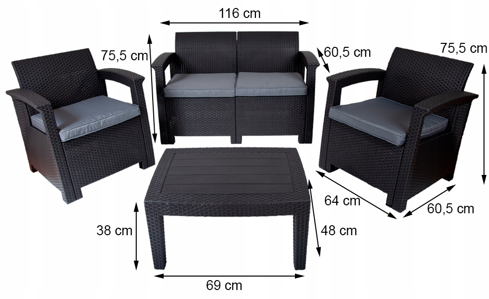 Комплект мебели MADRID предназначен для отдыха четырех человек. В комплект входит двухместный диван, два удобных кресла и журнальный столик. Диван и кресла имеют удобные и толстые подушки, которые обеспечивают максимальный комфорт при сидении. Плотные подушки оснащены застежкой-молнией, благодаря чему материал легко чистится.