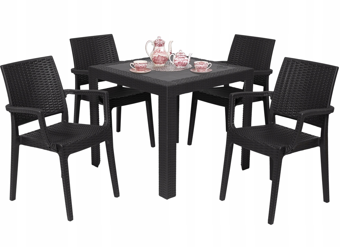 Столешница и стулья выполнены из литого полипропилена в стиле техноротанг. В середине столешницы имеется практичное и полезное отверстие для садового зонта.