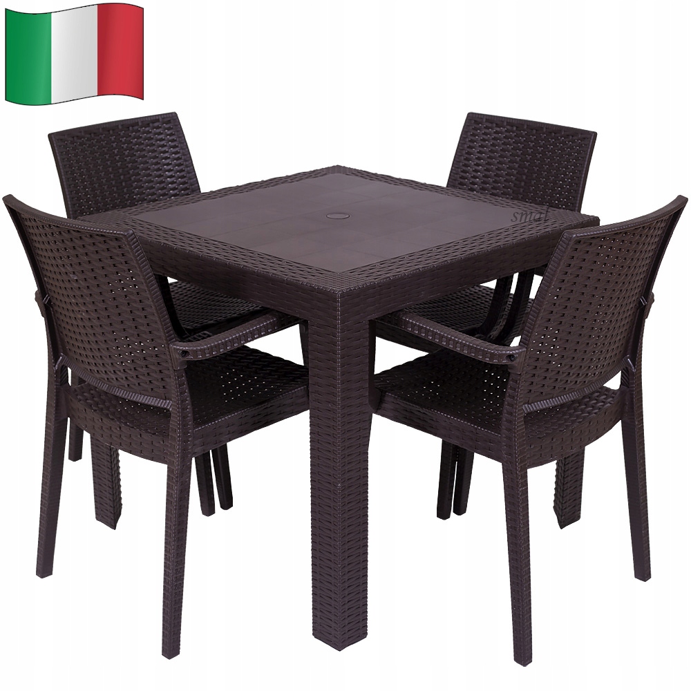 Столешница и стулья изготовлены из прочного материала. из литого полипропилена в стиле техноротанг. В середине столешницы имеется практичное и полезное отверстие для садового зонта.