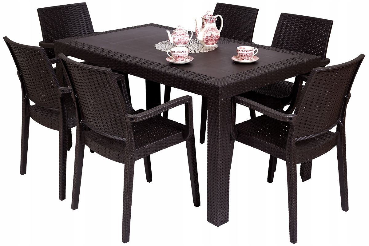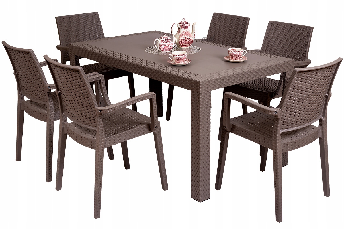 Столешница и стулья изготовлены из прочного материала. из литого полипропилена в стиле техноротанг. . В середине столешницы имеется практичное и полезное отверстие для садового зонта.