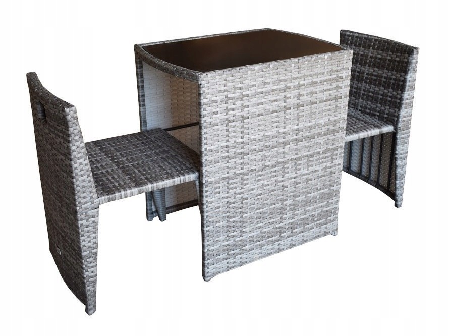 В комплект входят два кресла и стол, покрытые закаленным стеклом. Благодаря своим размерам кресла прекрасно прячутся под столом, что делает комплект идеальным как для сада, террасы, так и даже для самого маленького балкона.