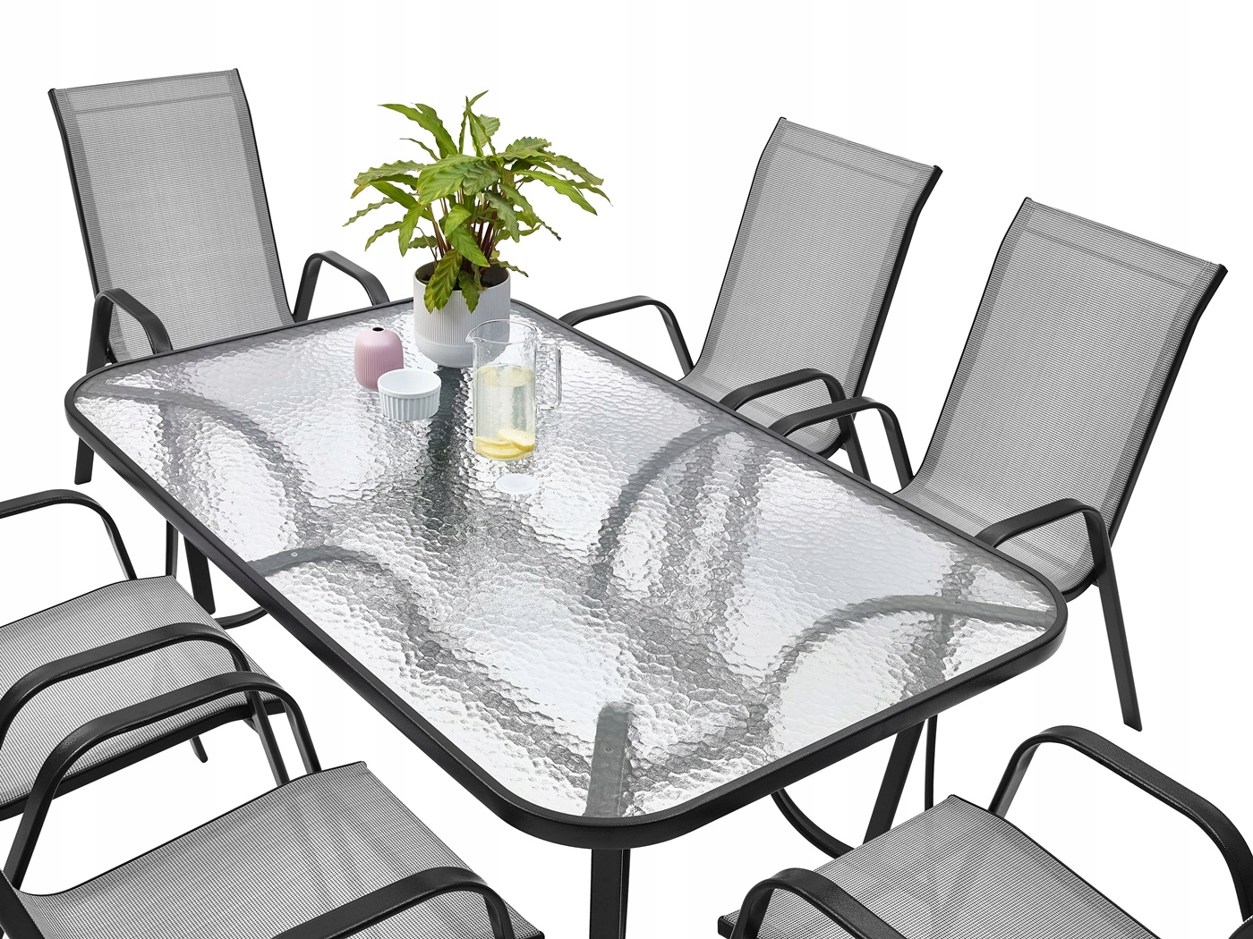 НАБОР САДОВОЙ МЕБЕЛИидеально подходит для вашего сада. Каркас имеет двойное порошковое покрытие, что делает этот продукт идеальным для использования как внутри, так и снаружи помещений. Сиденье и спинка стула выполнены из светло-серой гибкой текстильной обивки для максимального комфорта. Имеет две боковые спинки. Используемые материалы не требуют частого ухода, устойчивы к погодным условиям и не требуют специальных средств по уходу. Ножки дополнительно оснащены пластиковыми накладками.Стол имеет столешницу из прозрачного закаленного стекла. 5 мм, с отверстием для вставки садового зонта.