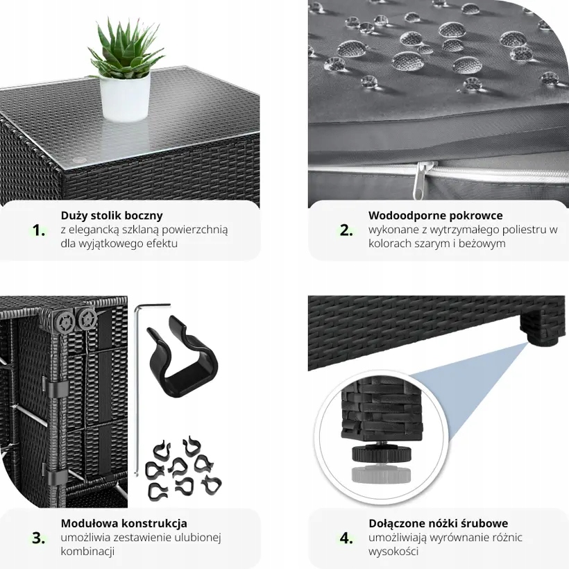 Наслаждайтесь солнечными лучами на свежем воздухе и закажите этот впечатляющий комплект садовой мебели. Стол, диван и стулья изготовлены из алюминия и покрыты тесьмой из техноротанга. Несмотря на небольшой вес, набор очень устойчив. Поверхность стола из стекла выглядит очень элегантно и легко чистится. Очень удобные подушки сиденья из полиэстера, подходящего по цвету к ротангу, застегиваются сзади на молнию, благодаря чему обивка легко чистится. Для защиты подушек от влаги поверхность материала пропитана, поэтому грязь и капли воды просто скатываются с нее (см. фото). Комплект состоит из нескольких отдельных элементов, поэтому его можно установить в любой конфигурации.