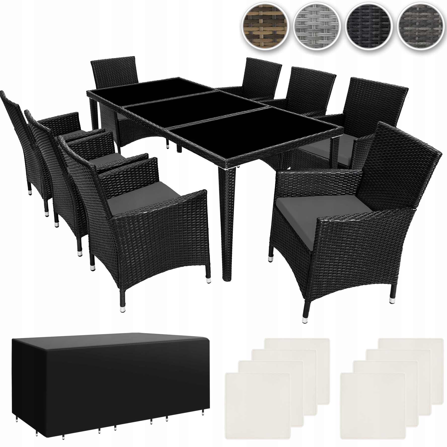 Благодаря нашему удобному и элегантному комплекту садовой мебели из техноротанга проводить время на природе станет настоящим удовольствием. Благодаря небольшому весу мебель легко транспортировать. С другой стороны, алюминиевые рамы очень устойчивы. Поверхность стола с тремя стеклянными элементами выглядит очень элегантно и легко чистится. Очень удобные сиденья из полиэстера бежевого цвета, сочетающиеся с цветом мебели; Они застегиваются на молнию сзади, что облегчает чистку обивки. Для защиты подушек от влаги поверхность наволочек пропитана, поэтому грязь и капли воды просто скатываются.