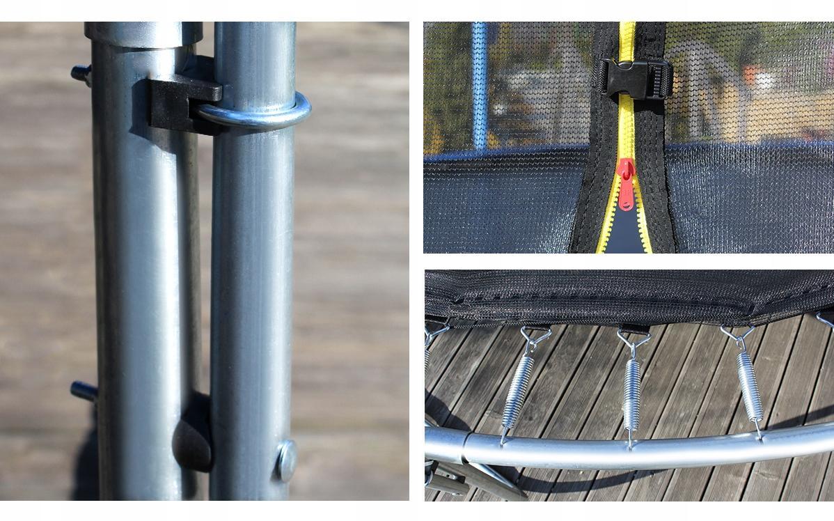 - Эргономика и безопасность — это функции, которые являются нашим приоритетом. Гибкая сетка повышает упругость батута, защищает безопасную игровую площадку и укрепляет конструкцию с помощью растяжек, прикрепленных к раме. Вся вещь изготовлена из водонепроницаемых материалов, устойчивых к неблагоприятному воздействию внешних факторов и УФ-лучей.