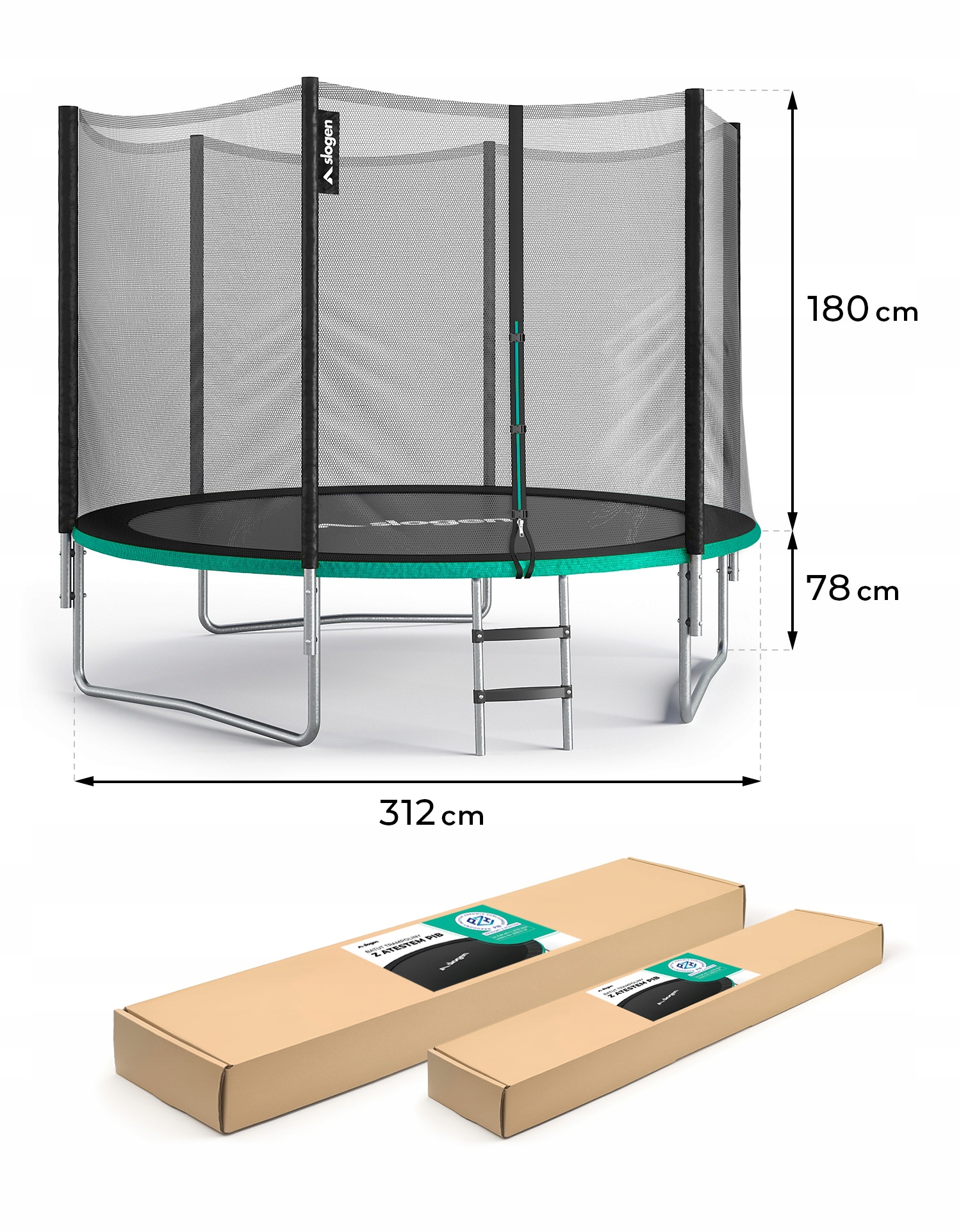 батут Slogen , является детальной проверкой и получила Attest Национального института общественного здравоохранения общественного здравоохранения PZH-Pib , подтверждая высокое качество и безопасность использования. Особенность - Тесты подтверждают сопротивление интенсивному использованию и неблагоприятным погодным условиям.