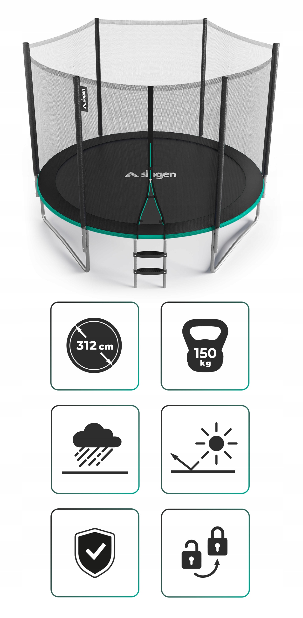 мы знаем, как важна безопасность b>, поэтому мы заботимся о них до первого прыжка. В наборе с батутом Slogen вы получите улучшенную лестницу с нашей системой безопасным Slogen .