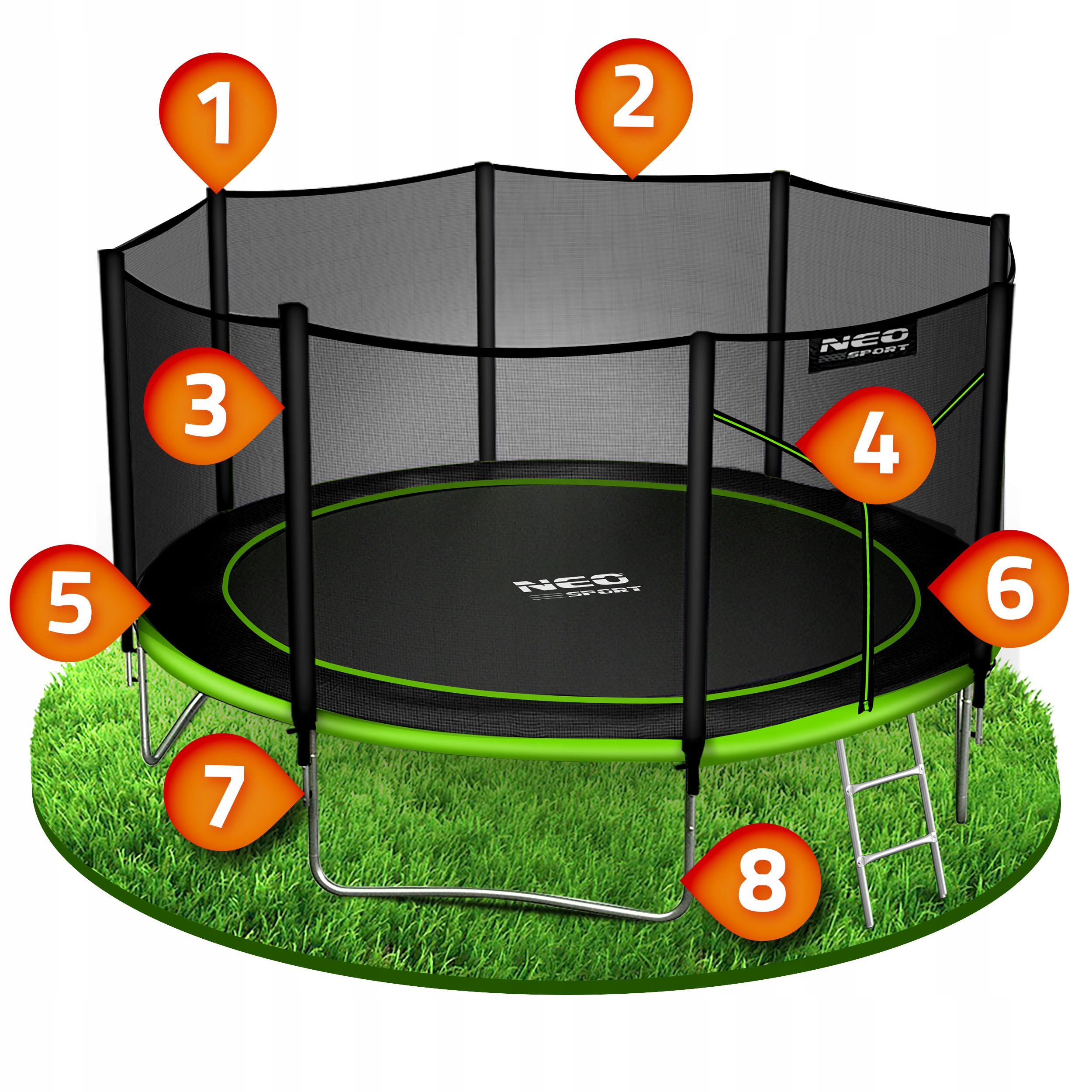 - Включен: садовый батут, сетка безопасности, металлическая лестница , Руководство пользователя