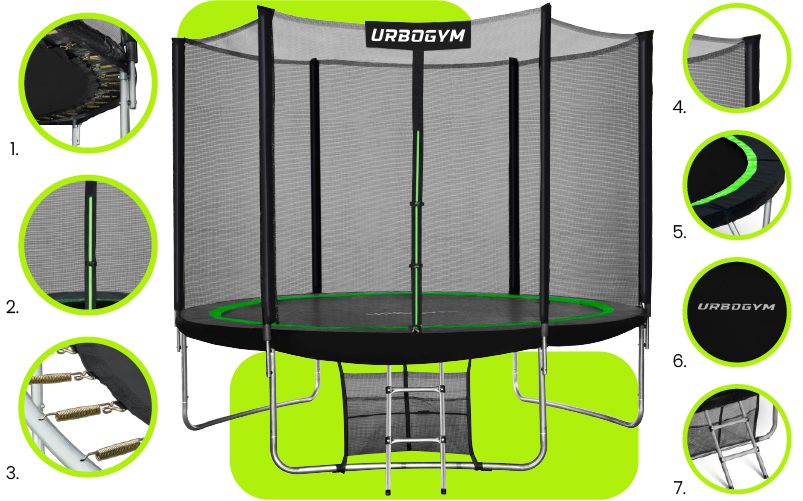 из батутного батута с самого высокого класса от Urbogym из серии, подготовленного для этого сезона. Изготовлен из очень хороших качественных материалов, обеспечивающих максимальный высокий уровень безопасности для всех пользователей. Наши батуты можно хранить в саду без страха, потому что они устойчивы к ультрафиолетовому и ультрафиолетовому излучению.