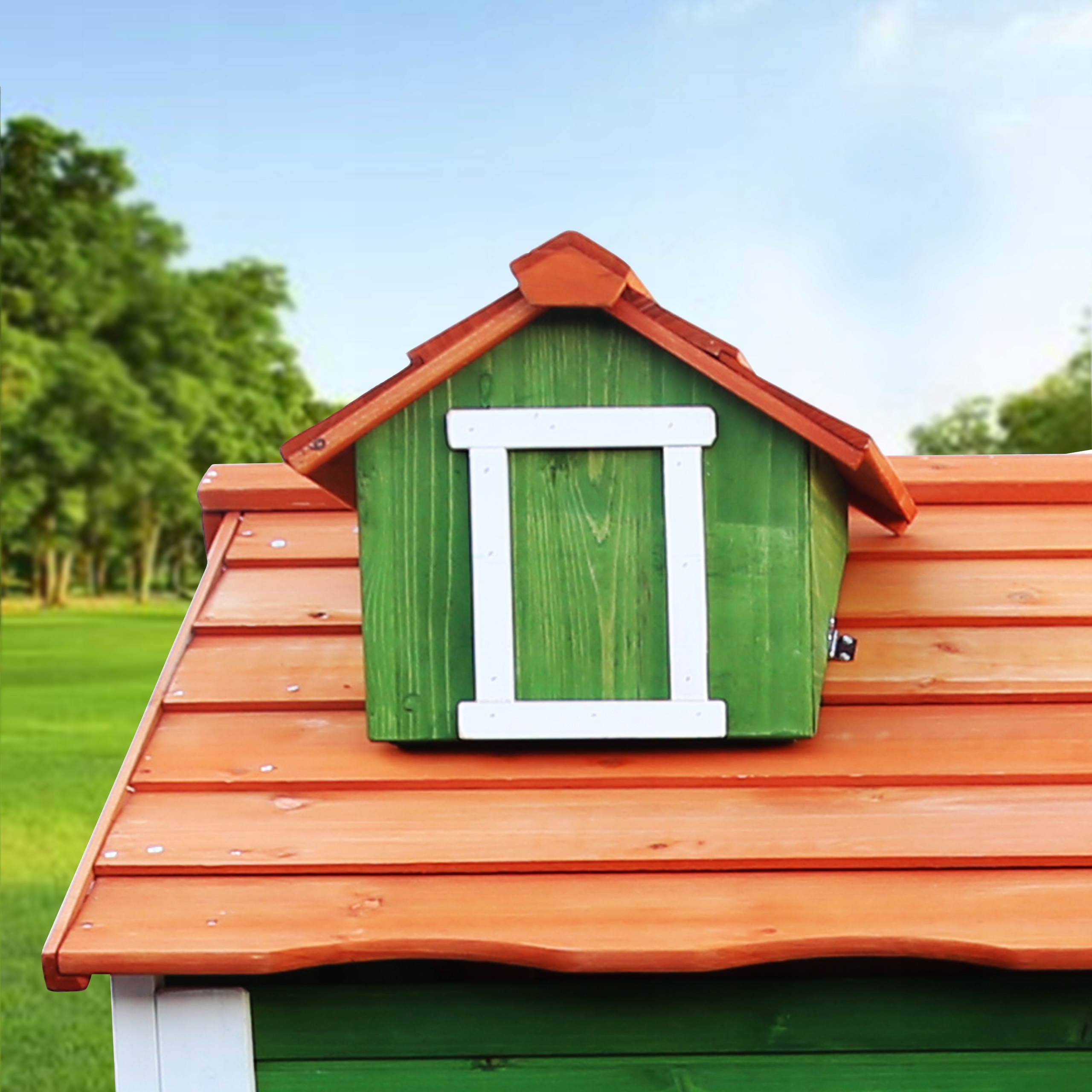 Дом имеет практическую крышу над входом, которая защищает от солнца и легкого дождя. Ребенок может спрятаться под ним или мирно играть в дверь - независимо от погоды!