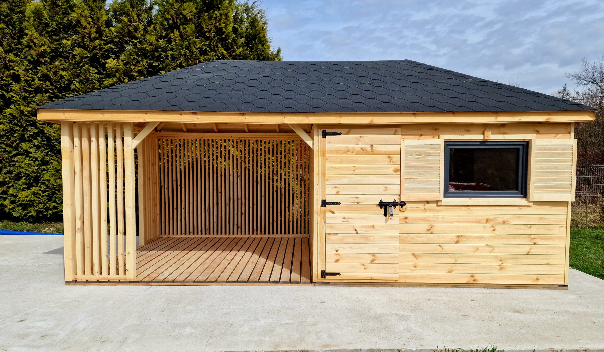 Инструментальный домик с беседкой, общие размеры 6м х 3м.