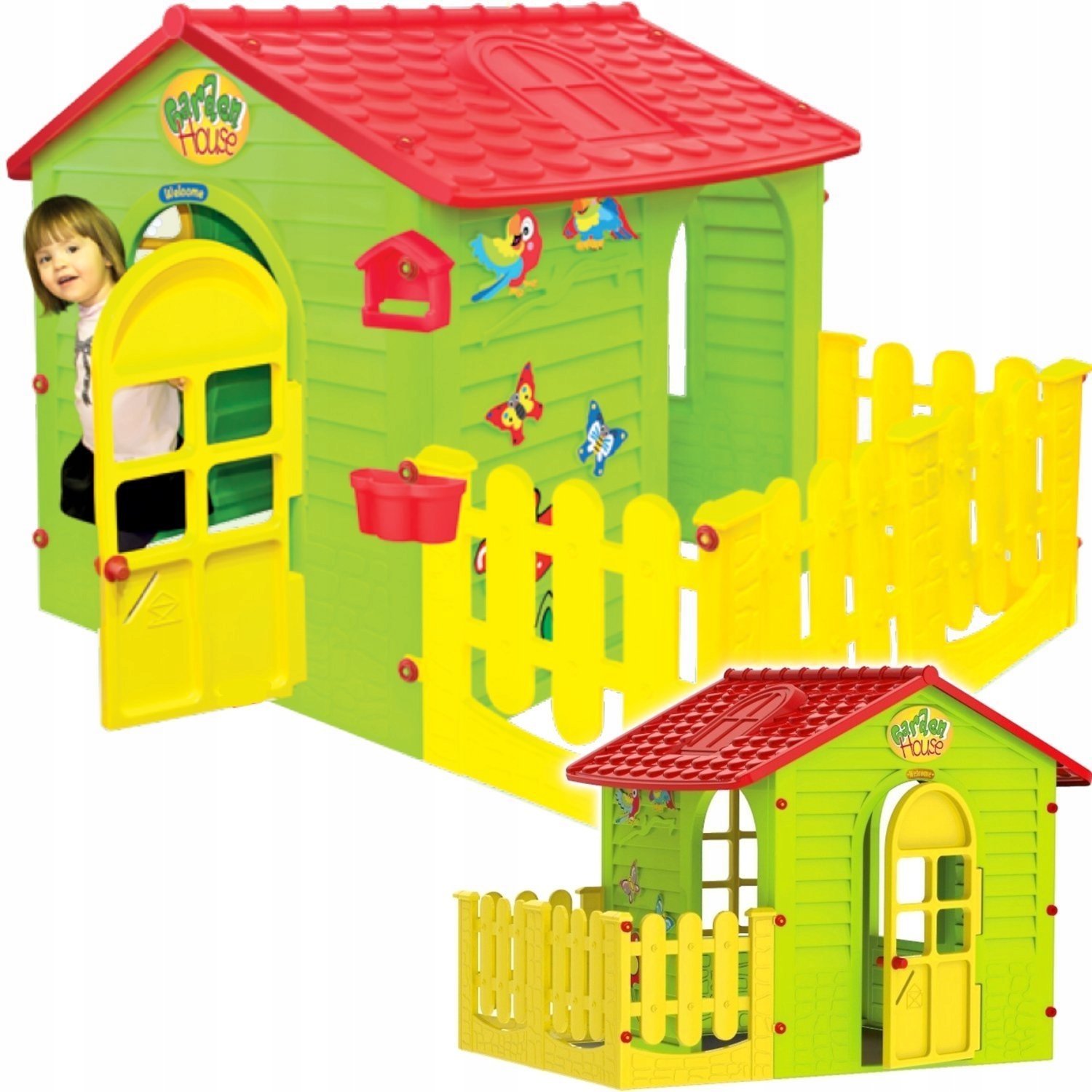 Садовый домик для детей. Дом украшен мотивами попугаев, бабочек и цветов. Оснащен открывающимися дверцами и окнами, кормушкой для птиц, горшком для растений и цветов и яркими декоративными наклейками.