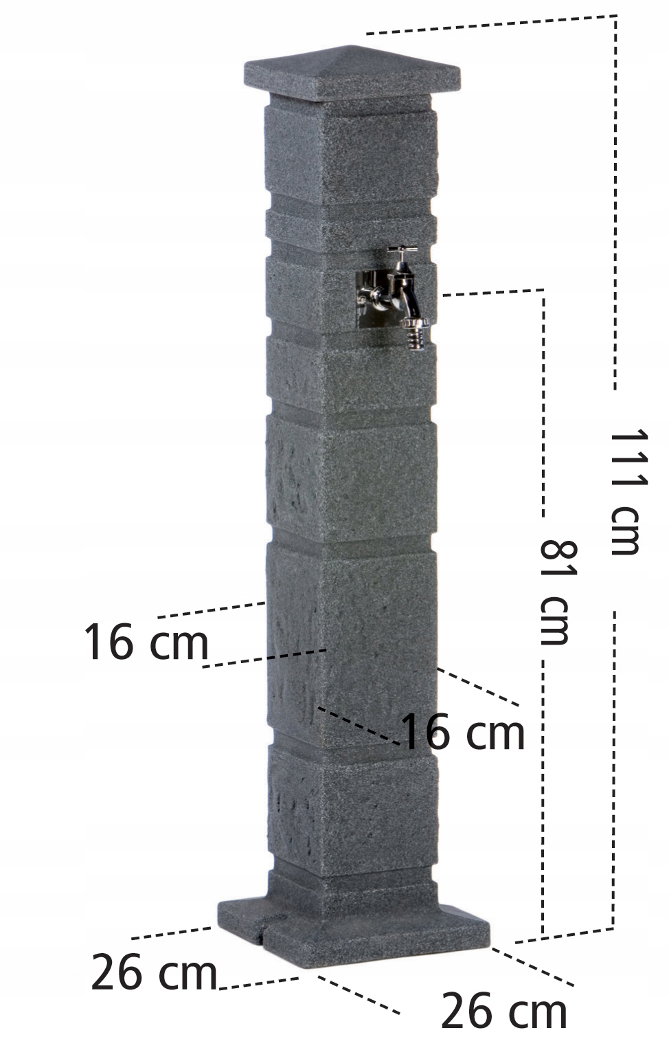 Размеры: Высота: 110 см, Ширина: 16 см, Глубина: 16 см, Нижняя плита: 26 х 26 см.