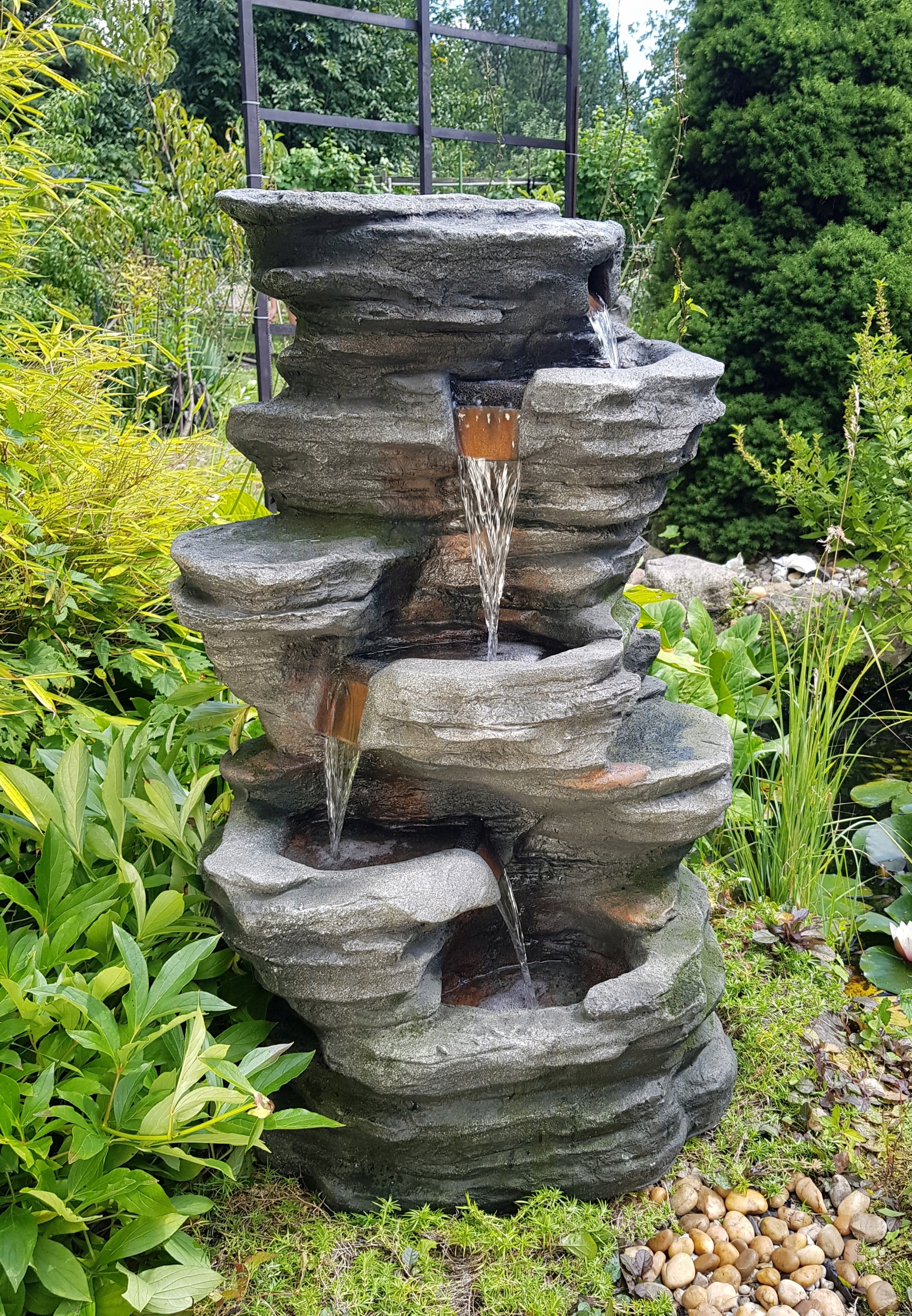 Фонтан работает по замкнутому контуру, поэтому не требует постоянного подключения к воде или рытья специального резервуара для воды. Мы можем переместить его и изменить его местоположение в любой момент. Просто налейте внутрь необходимое количество воды и подключите насос, идущий в комплекте с фонтаном, к электричеству. И все! Более того, благодаря энергосберегающей светодиодной подсветке в фонтане мы за небольшие деньги поддержим чудесную атмосферу.