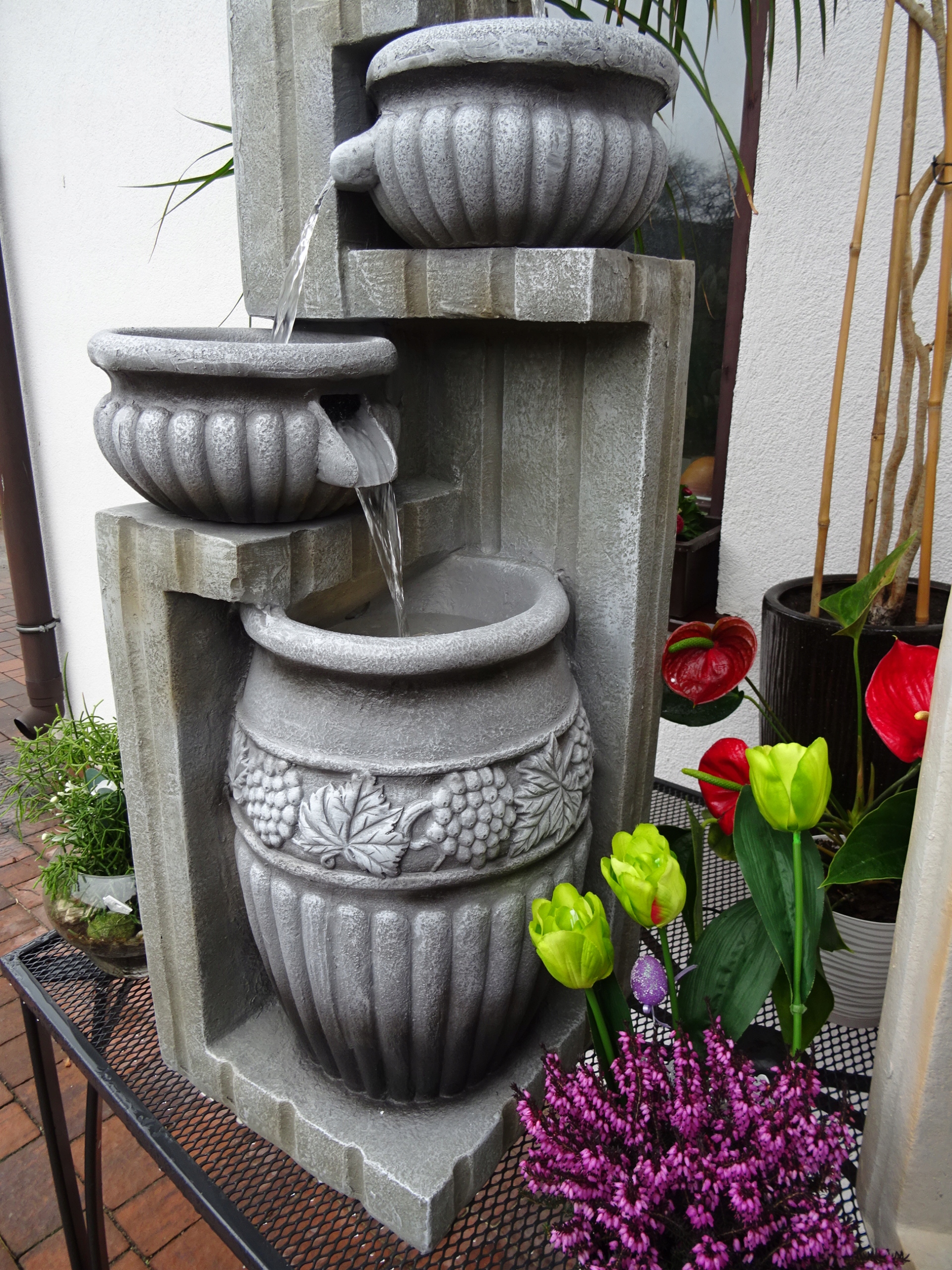 Фонтан закрытого типа, вода из нижнего резервуара перекачивается в верхний резервуар, откуда каскадом стекает вниз - под действием силы тяжести...... здесь этого не слышно , но это приятный и приятный опыт, который закрывает глаза - вы можете почувствовать ощущение присутствия рядом с естественным потоком
