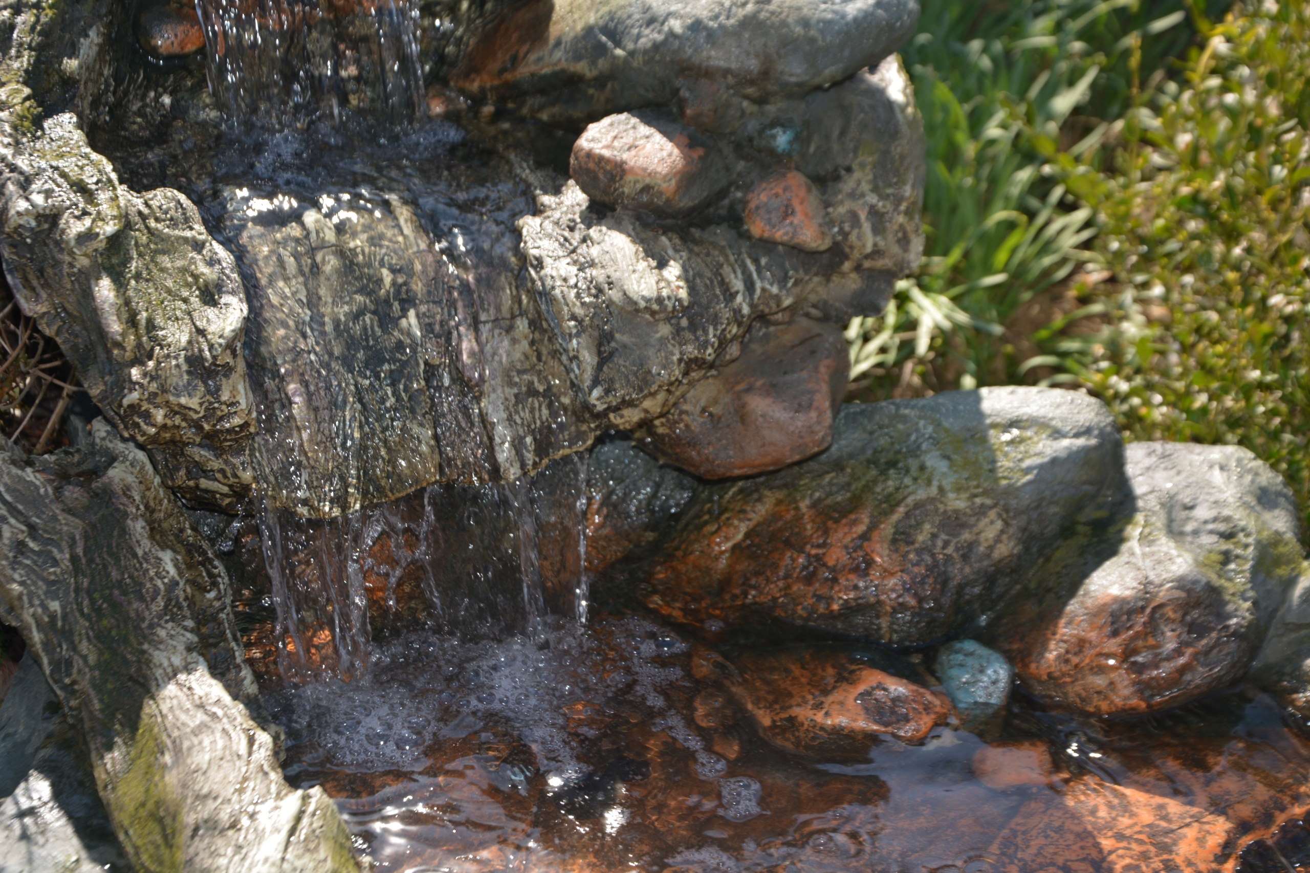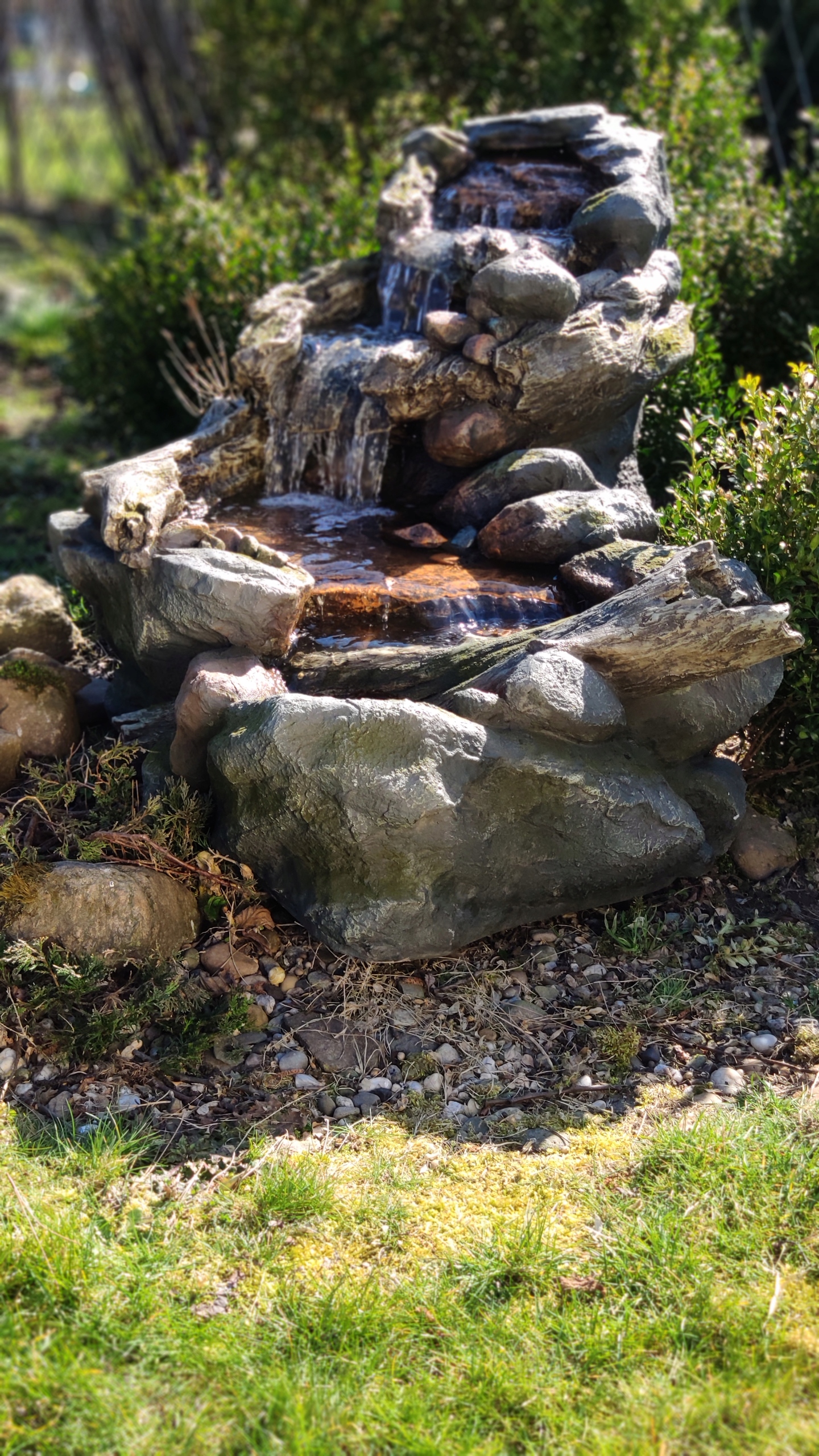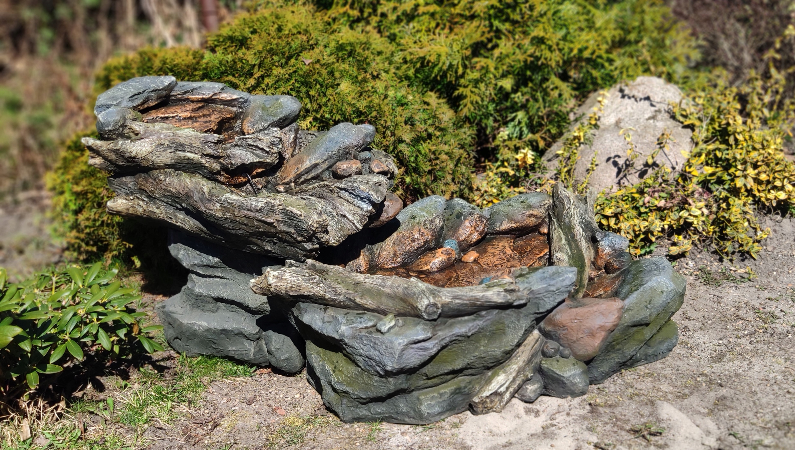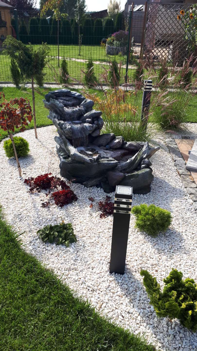 Фонтан состоит из трех частей с естественным, пологим водопадом. Если мы хотим придать ему еще более естественный вид, стоит использовать для украшения его боков камни и соответствующие растения.