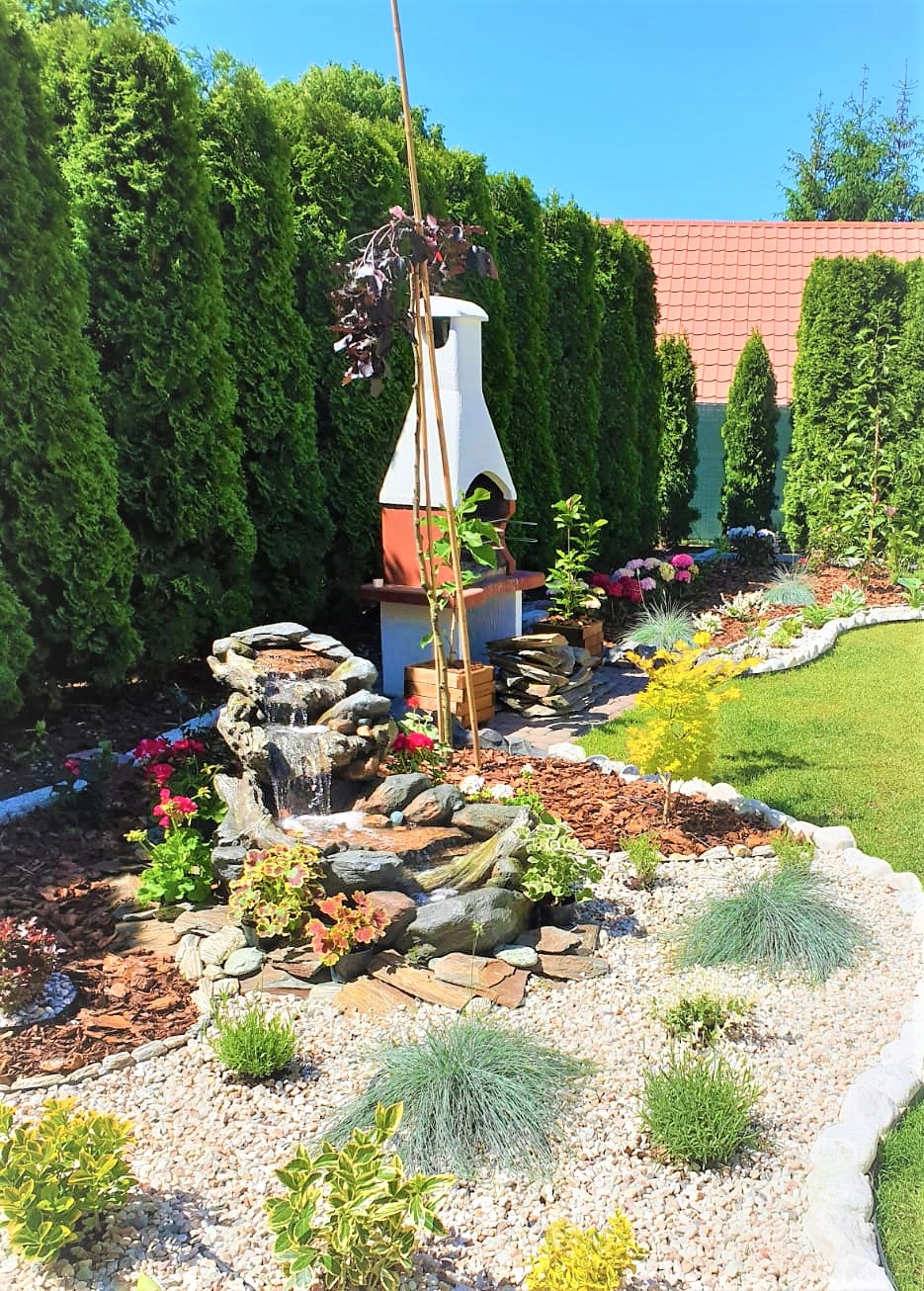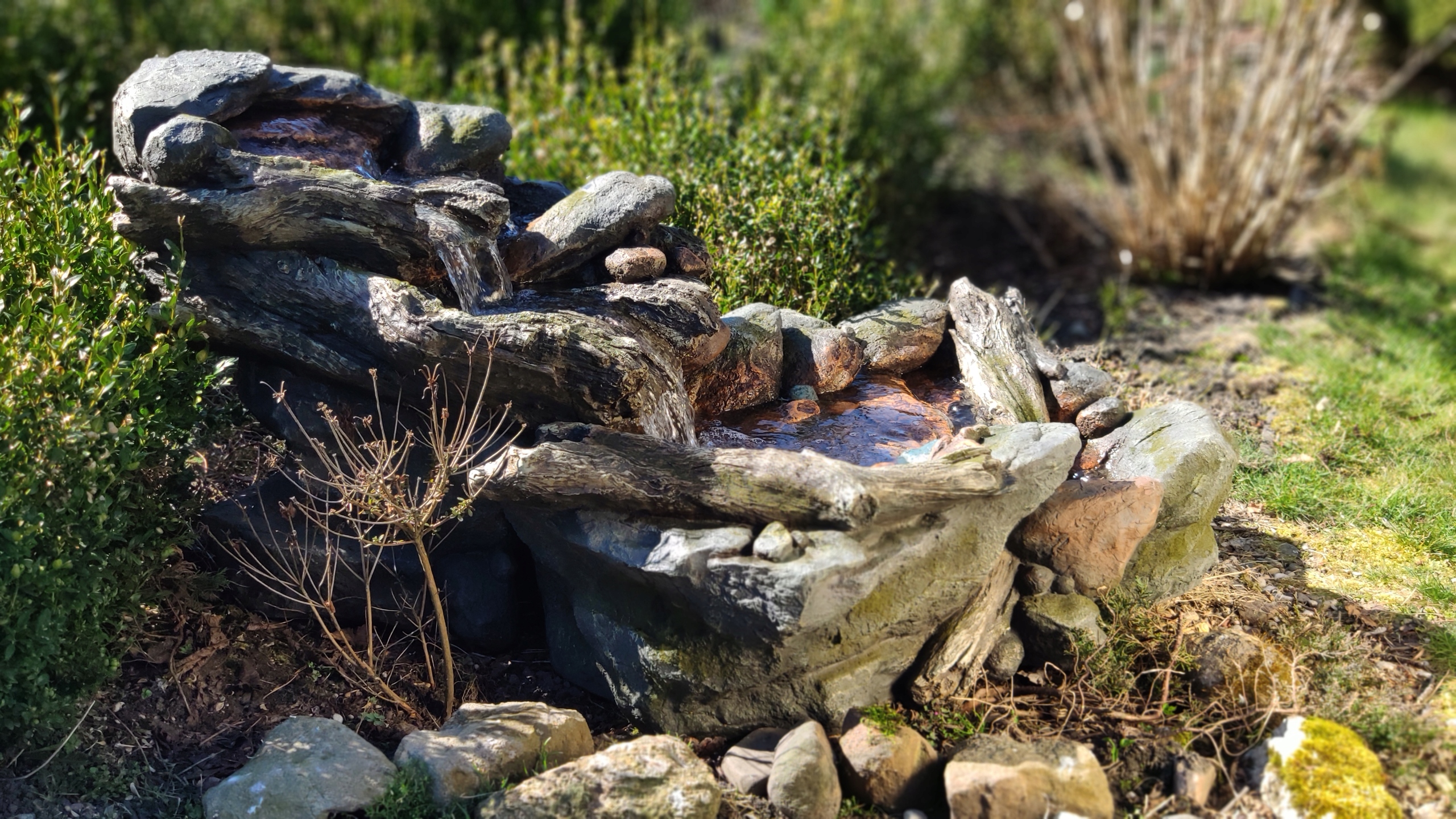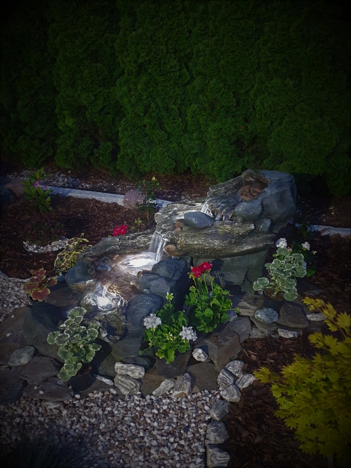 Фонтан состоит из трех частей с естественным, пологим водопадом. Если мы хотим придать ему еще более естественный вид, стоит использовать для украшения его боков камни и соответствующие растения.
