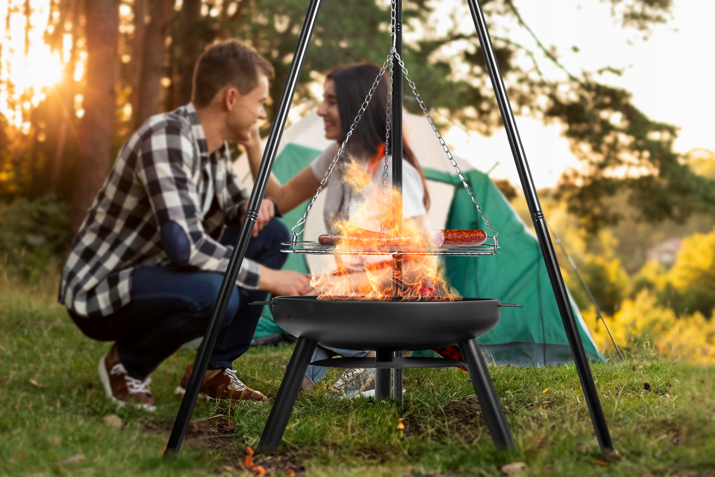 Садовая яма для костра на треноге с решеткой, рамой и цепью более экологична, чем другие источники энергии.