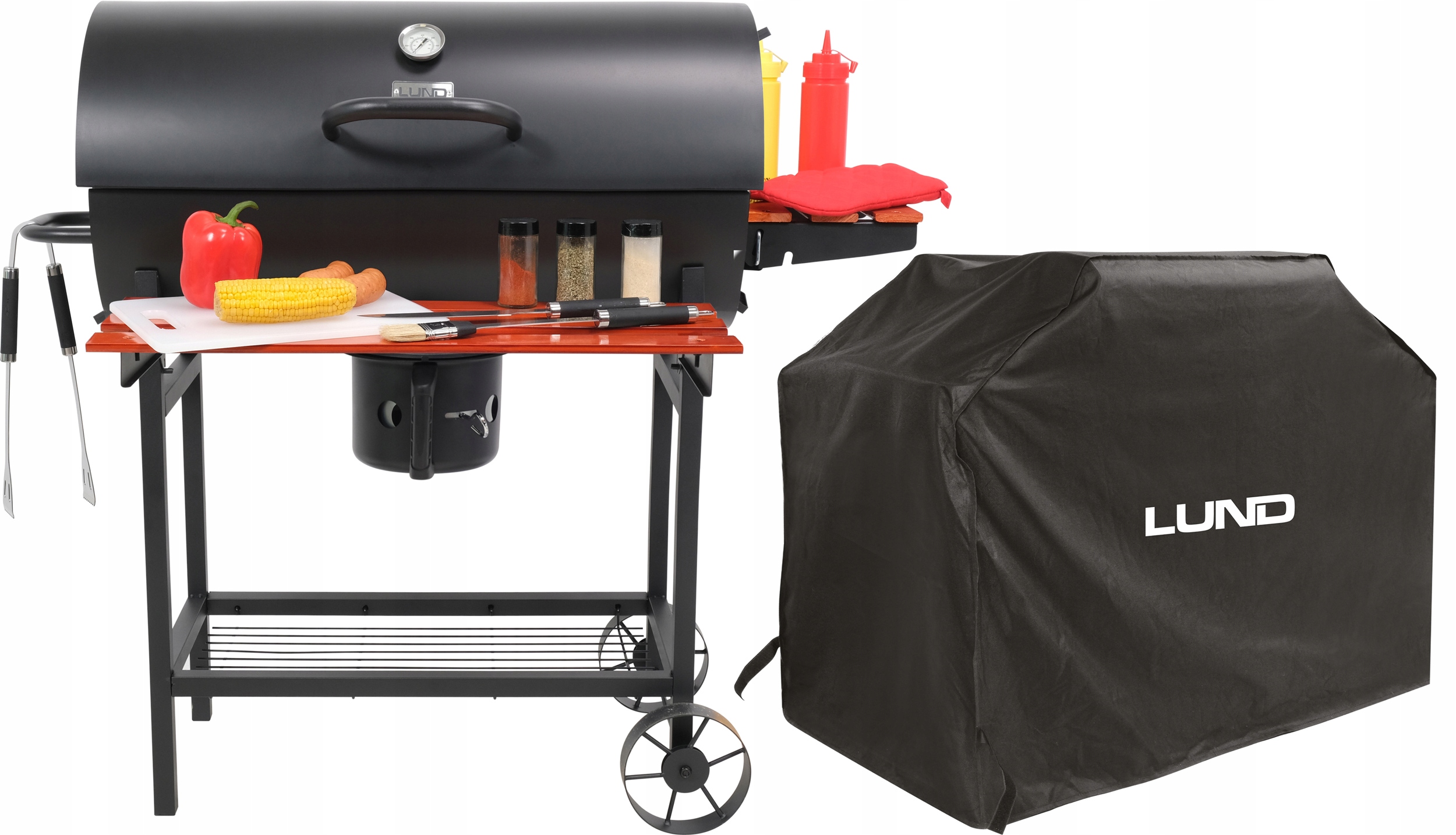 Популярный угольный гриль LUND 99908 с хромированной решеткой, нагревательной решеткой и крышкой, поддерживающей температуру. Он оснащен многочисленными удобствами: