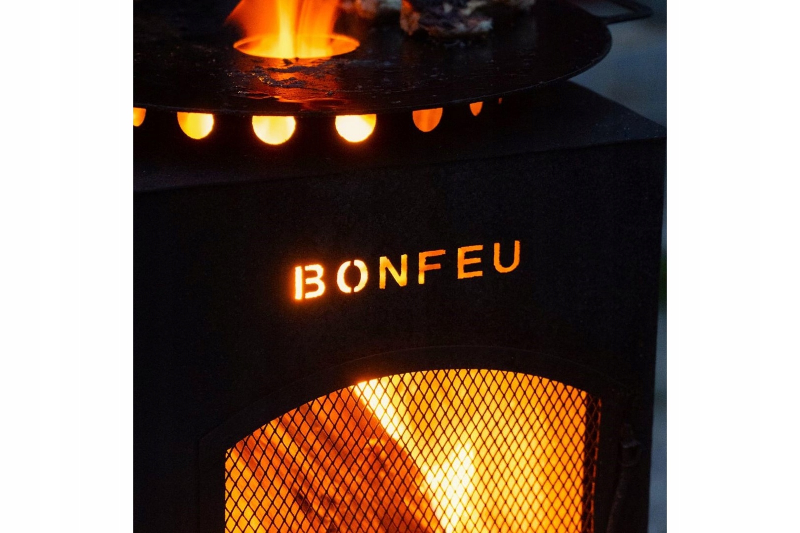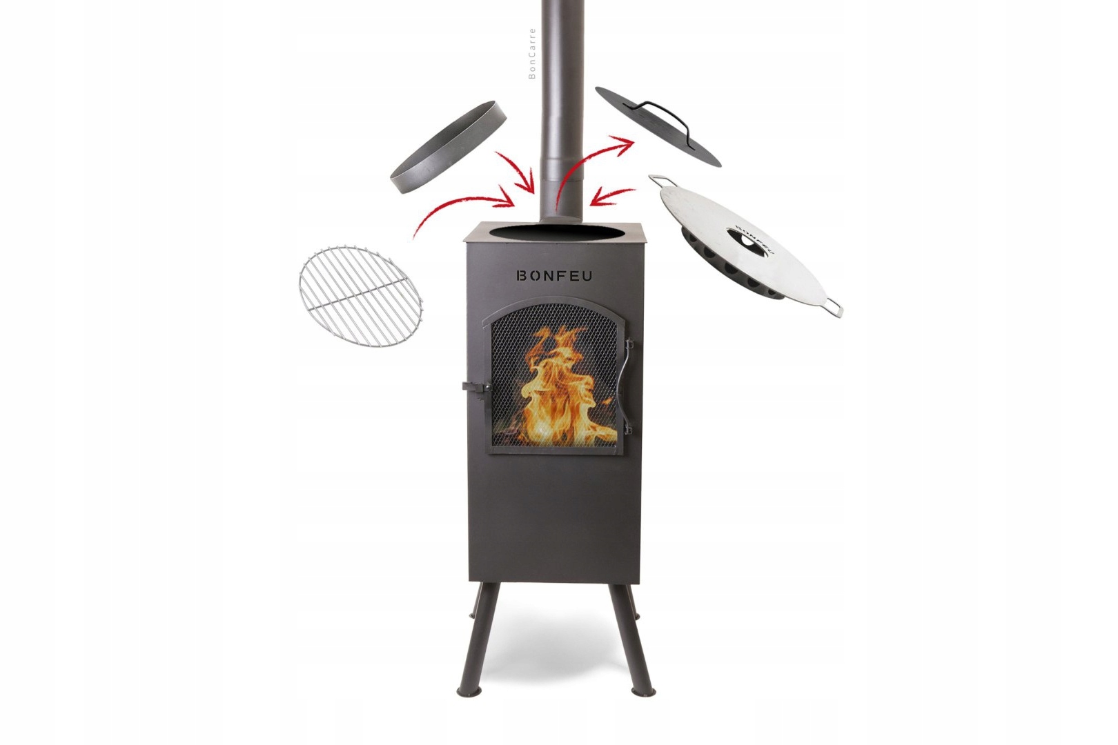 Уникальной особенностью камина Boncarré является его функциональность как барбекю. Камин оснащен крышкой, которую можно легко заменить на три различных аксессуара: решетка для гриля, кольцо вок или плоская пластина. Все эти элементы могут быть установлены на вершине Boncarré после удаления обложки. Вы также можете изменить крышку и использовать его в качестве кулинарных тарелок, например, для приготовления чая.