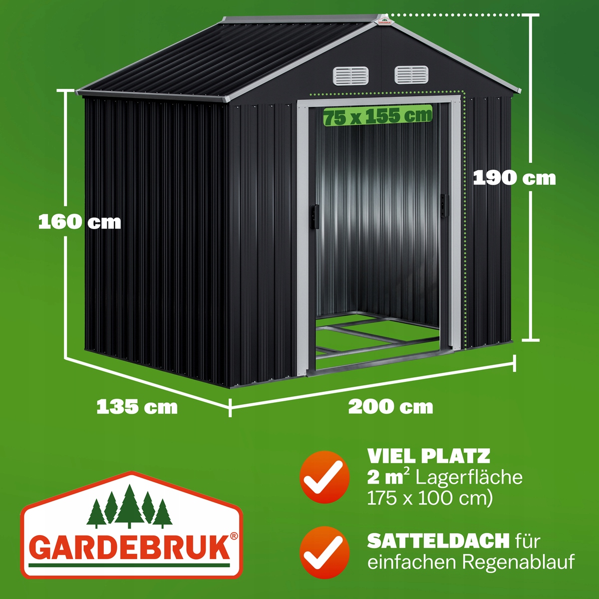 - Общие размеры с LXDXH крыши: 200 см х 135 см x 190 см.