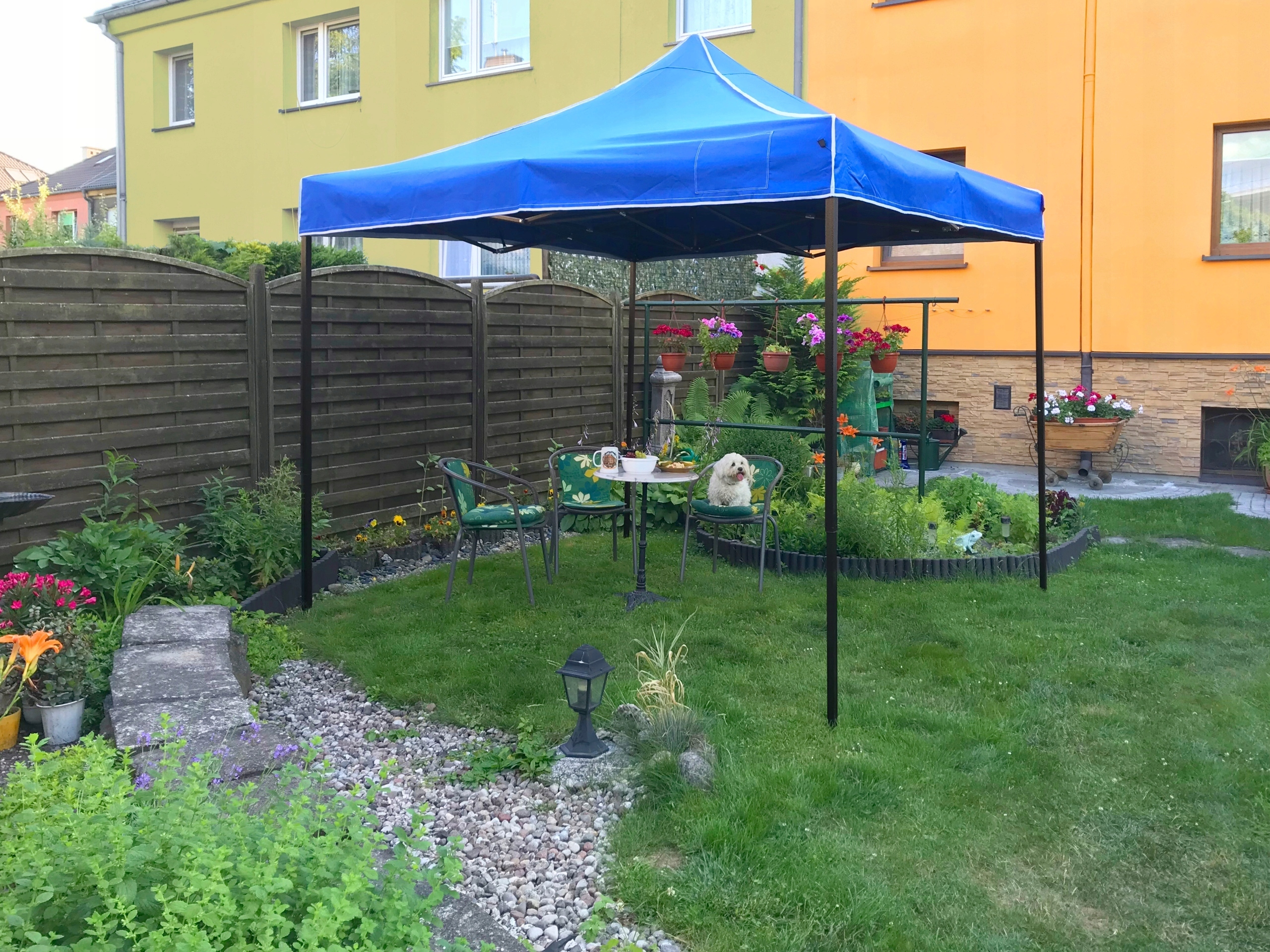 Складной павильон имеет телескопические ножки с регулируемой высотой, которые достигают боковой высоты ок. 2,30 м на самом высоком уровне.