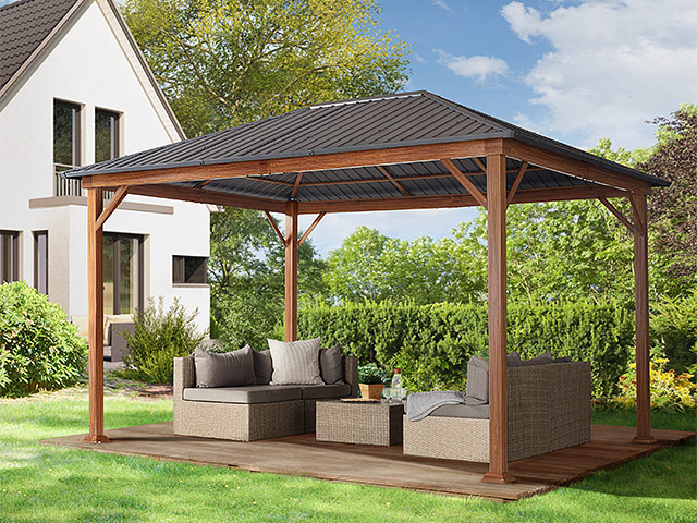 Стальная жесткая крыша прекрасно защищает павильон Superior от неблагоприятных погодных условий, устойчива к дождю и снегу. Благодаря прочной стальной крыше павильон чрезвычайно устойчив и может использоваться круглый год. В отличие от садовых павильонов с крышей из полиэстера, этот павильон может оставаться в саду все время.