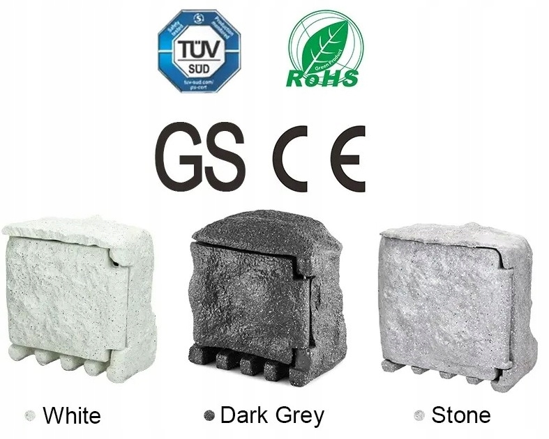 Необходимый монтажный материал входит в комплект поставки. Соединительный кабель длиной 2 м позволяет свободно разместить каменную розетку в саду.