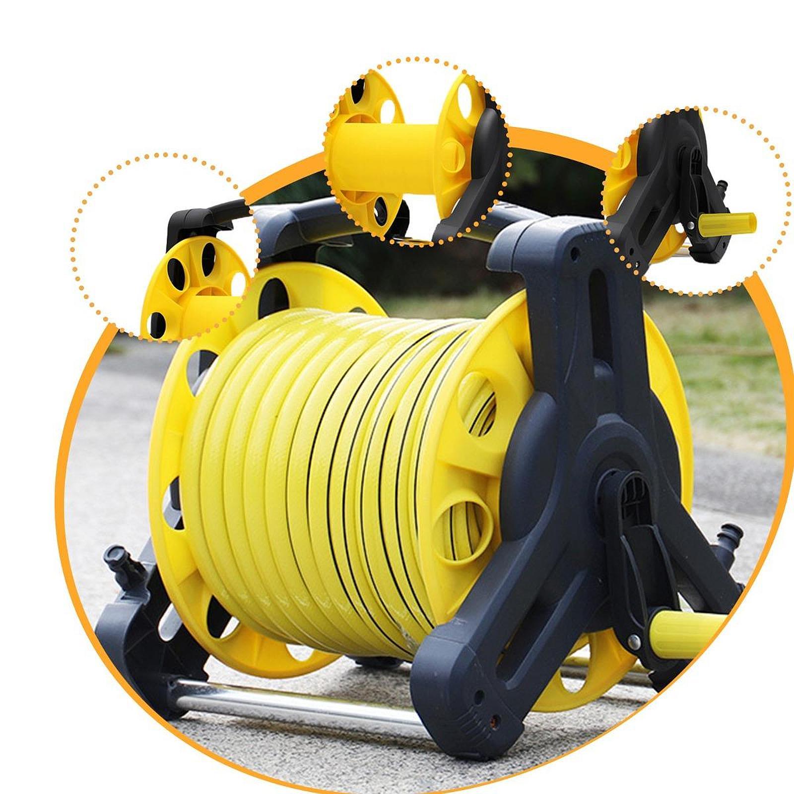 [Проблемное управление шлангом]: коляска для катушки для садового шланга была разработана для предотвращения запутывания и завязки, что облегчает аккуратное хранение шланга. Его размеры составляют 39 см х 32 см х 33 см, что обеспечивает компактное решение для ваших потребностей в садоводстве