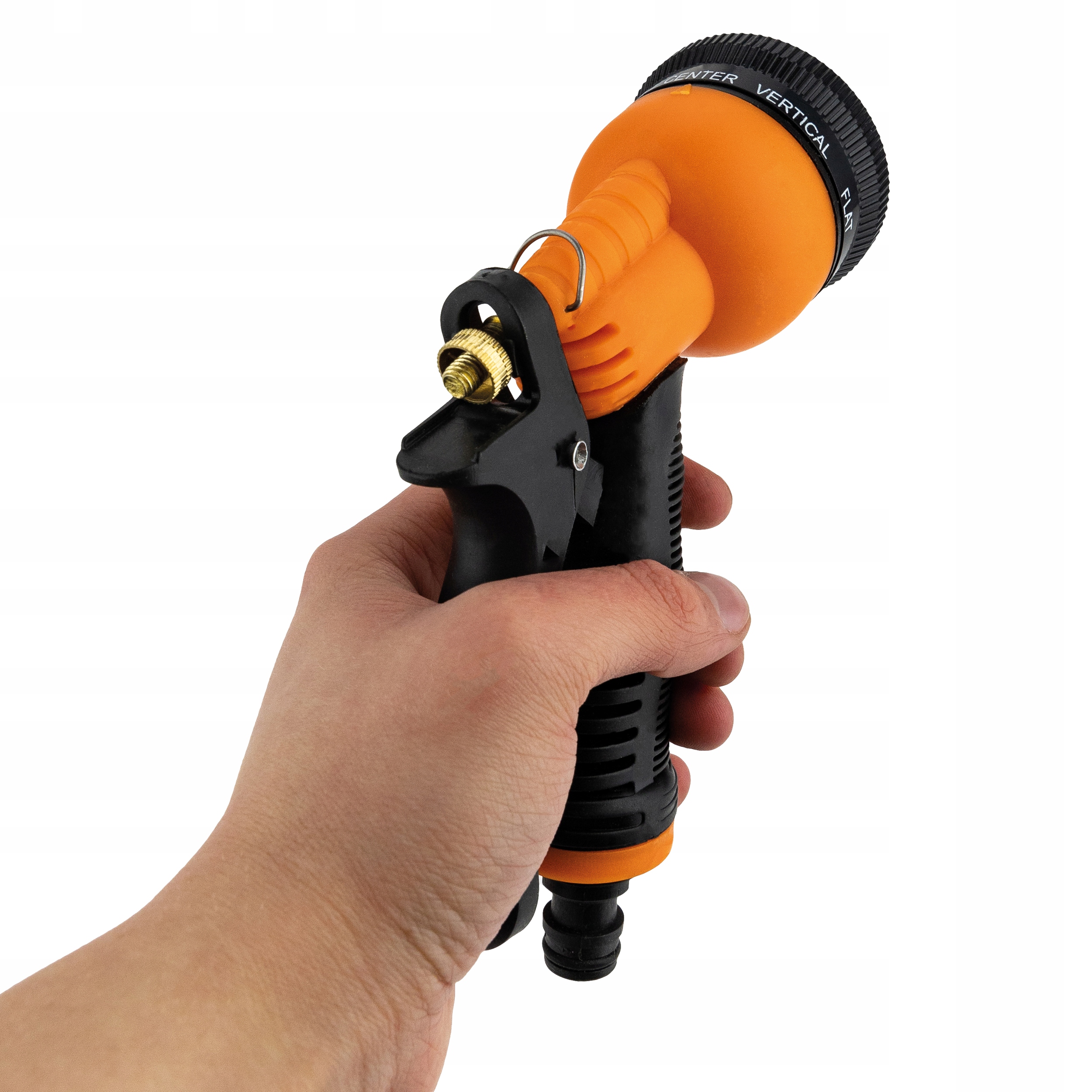 Основная задача садового пистолета – аккуратно опрыскивать и поливать растительность, чтобы не повредить его сильной и мощной струей прямо от змеи. Многофункциональный садовый пистолет, благодаря встроенному механизму регулирования, позволяет выбирать из 8 доступных функций струи воды и позволяет регулировать интенсивность струи. Режимы меняются поворотом вращающейся головки. Пистолет оснащен удобной нескользящей ручкой и фиксатором слива воды, что позволяет осуществлять полив без необходимости постоянно нажимать на спусковой крючок – достаточно сдвинуть металлический крючок на пистолете.