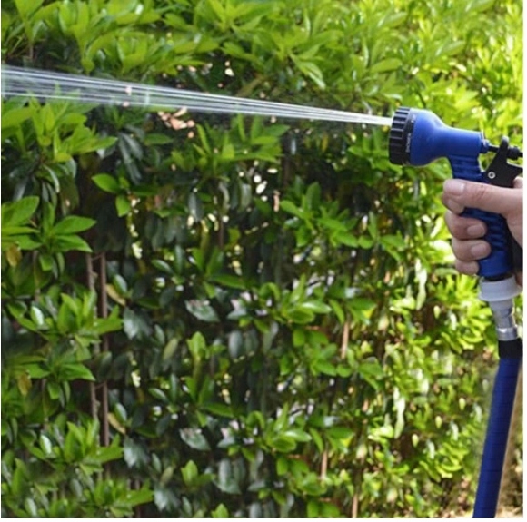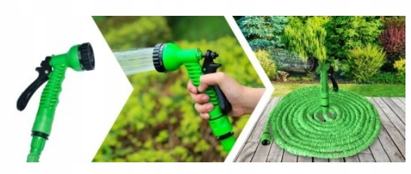 УДЛИНИТЕЛЬНЫЙ ШЛАНГ — внешняя часть шланга и двойной слой латекса — растягивающийся внутренний шланг. Благодаря этому он устойчив к высокому давлению и не гнется. Он очень легкий по сравнению с традиционными шлангами. Его длина составляет от 10 метров в состоянии покоя до 30 метров в состоянии слива воды. Занимает очень мало места.