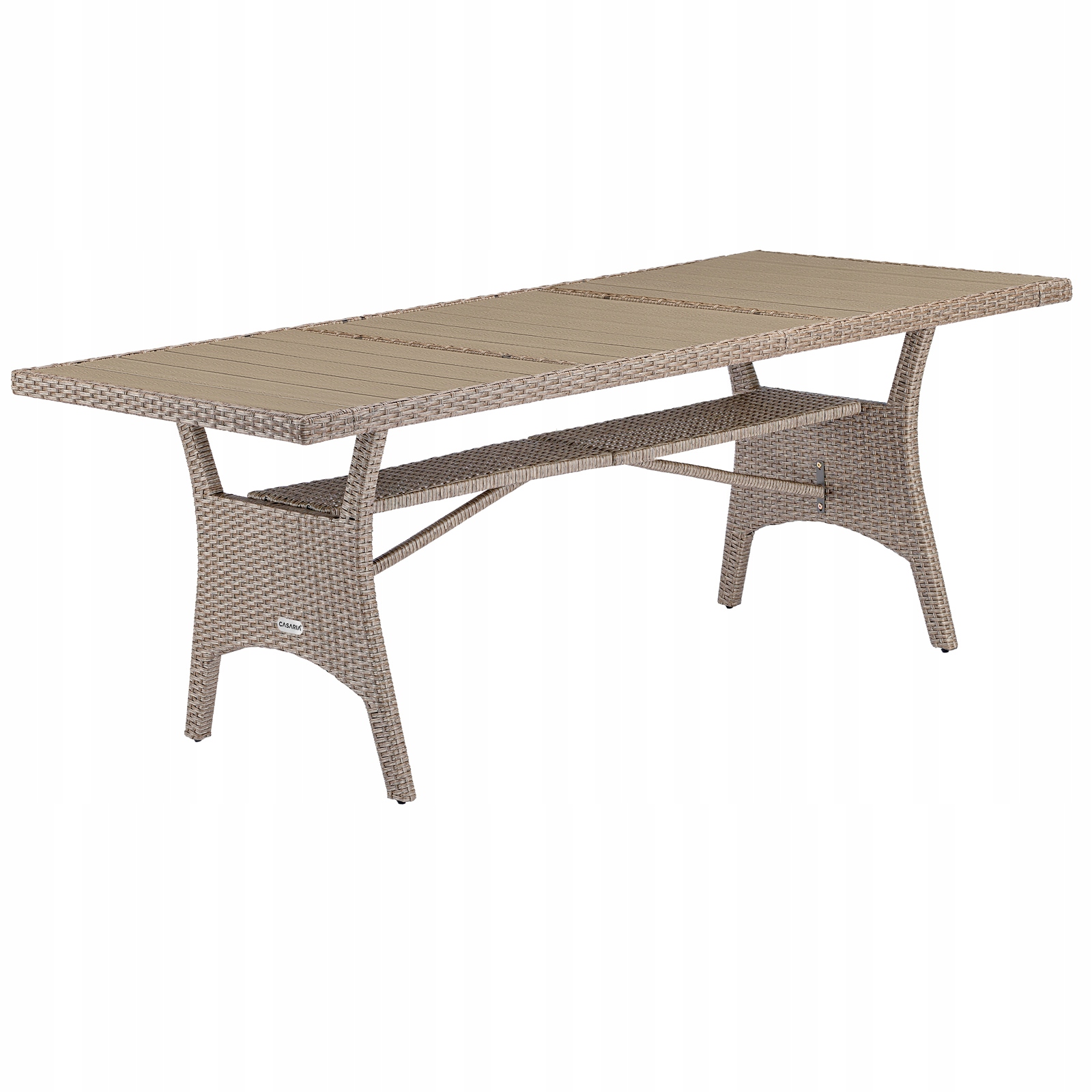Садовый стол из полиротанга размерами 190x90x75 см оснащен очень прочной и устойчивой столешницей из ДПК, имитирующей дерево.
