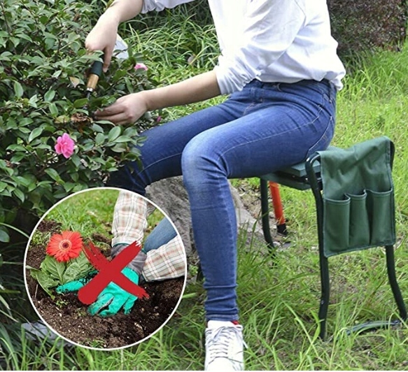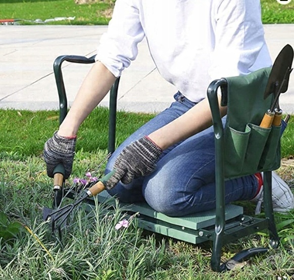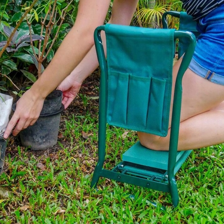Колено и сиденье оснащены большой сумкой для инструментов. В которой есть 3 кармана для хранения садовых инструментов, таких как ножницы, лопаты, инструмент для борьбы с сорняками. , семена, ленточные садовые ножницы, мастерок, щипцы и ручные секаторы. Крышка съемная и станет хорошим помощником в садоводстве.
