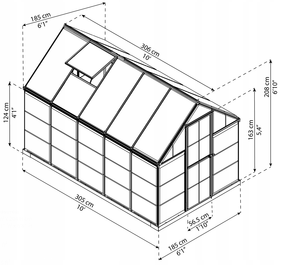 - Размеры теплицы (длина х ширина х высота) (см): 305 х 185 х 208