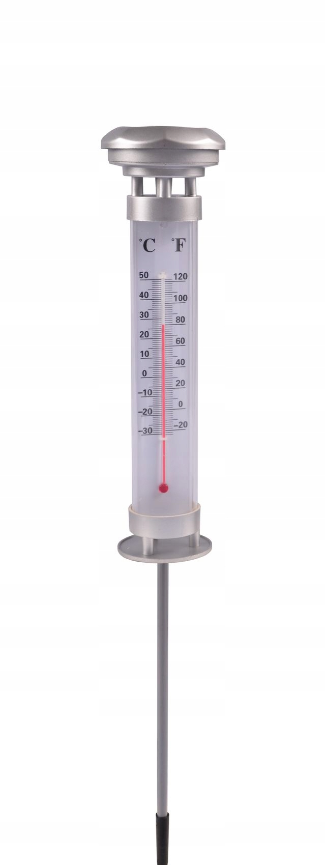 Термометр имеет встроенную солнечную панель на верхний, который питает расположенный под ним светодиод. свет освещает термометр сверху.