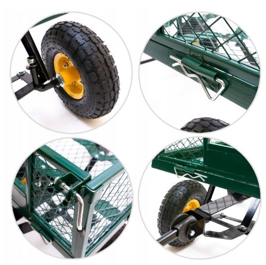 садовые коляски оснащены осью кручения, которая обеспечивает легкое маневрирование даже при очень высокой нагрузке. Благодаря использованию стальных строительных материалов, мы можем быть уверены, что ось и вся конструкция тележки выдержит тяжелые нагрузки.